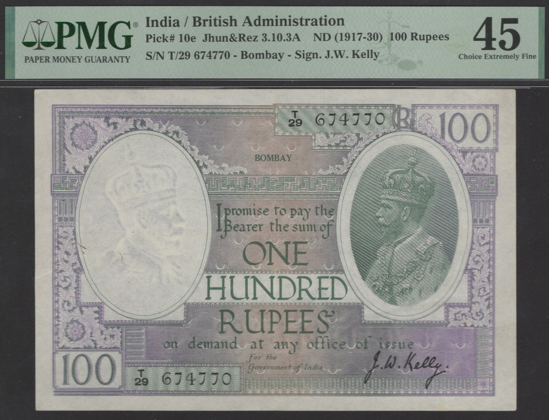 India. British Administration. Government of India. 100 Rupees. ND (1917-1930). Bombay. P-10c, J&R 3.10.1C. No. T/29 674770. Violet and green. Oval portrait of George V at right. PMG Choice Extremely Fine 45, spindle holes at issue (wrong ref. no. on PMG label). A rare and popular note.
