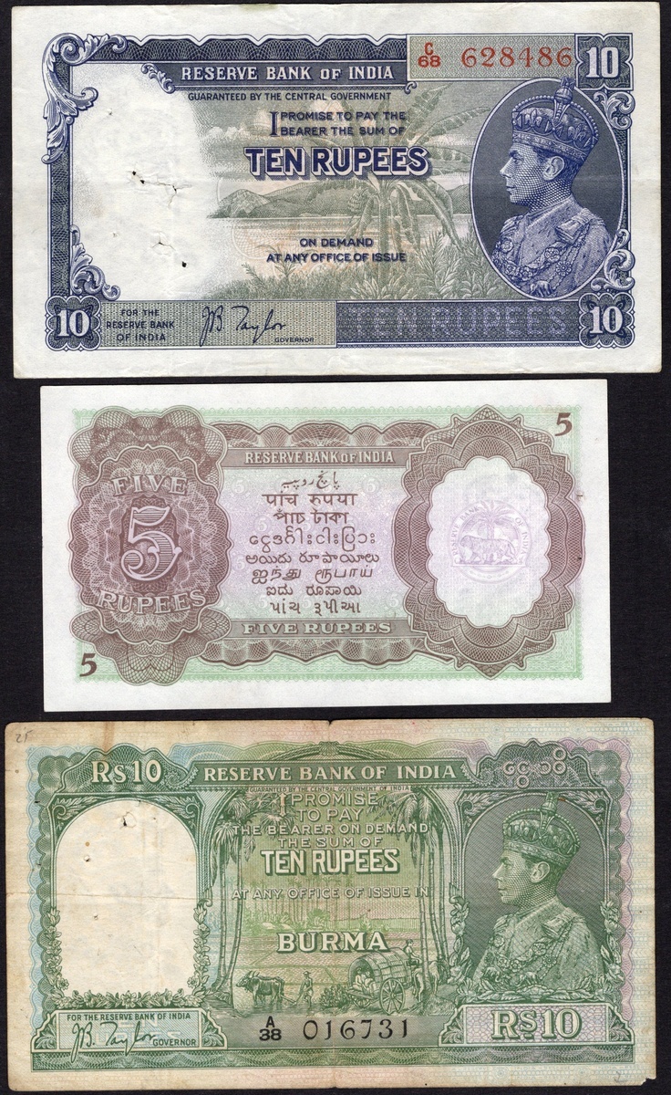 India. British Administration. Reserve Bank of India. 1937 issue trio: 2 Rupees. P-17b (1943). About EF, staplehole; 5 and 10 Rupees. P-18a, 19a. Uncirculated, and VF, stapleholes. George VI at right; also Burma. 5 and 10 Rupees P-4, 5. AU, rusted staplehole, and About Fine, staplehole, pencil annotations; and 1947 Provisional Issue 5 Rupees, P-31. AU-Unc, staplehole. [6]
