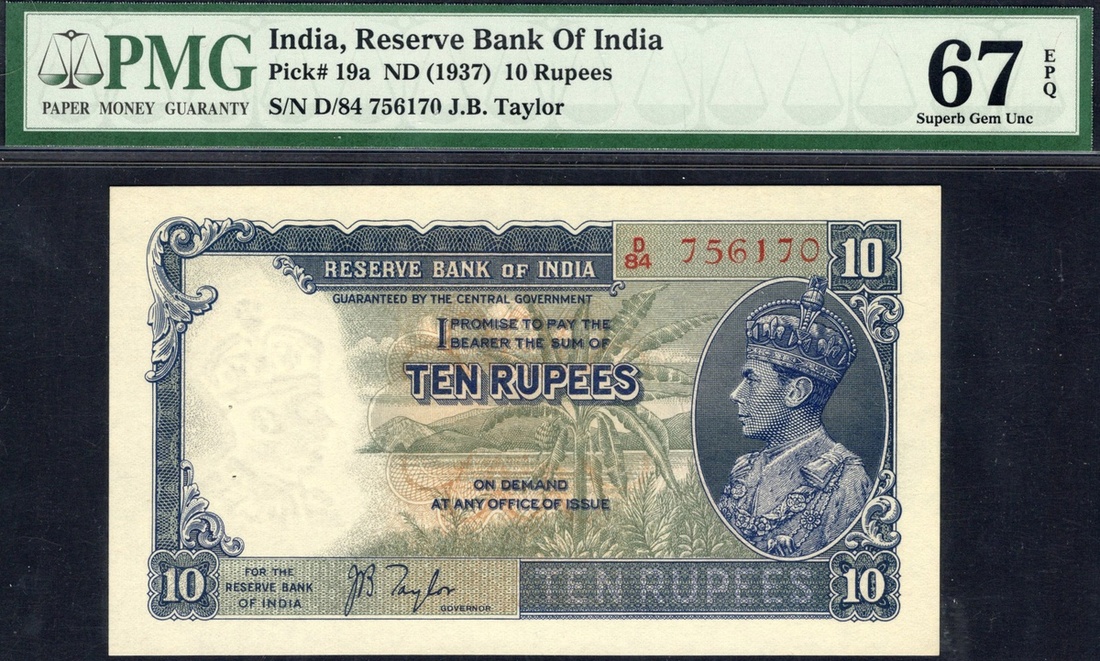 India. British Administration. Reserve Bank of India. 10 Rupees. ND (1937). P-19a. No. D/84 756170. Blue-violet and olive. Signed: J.B. Taylor. George VI at right, palm tree, lake and mountain range at center; Bank seal, elephant with mahout either side on back. PMG Superb Gem 67 EPQ, staple holes at issue.