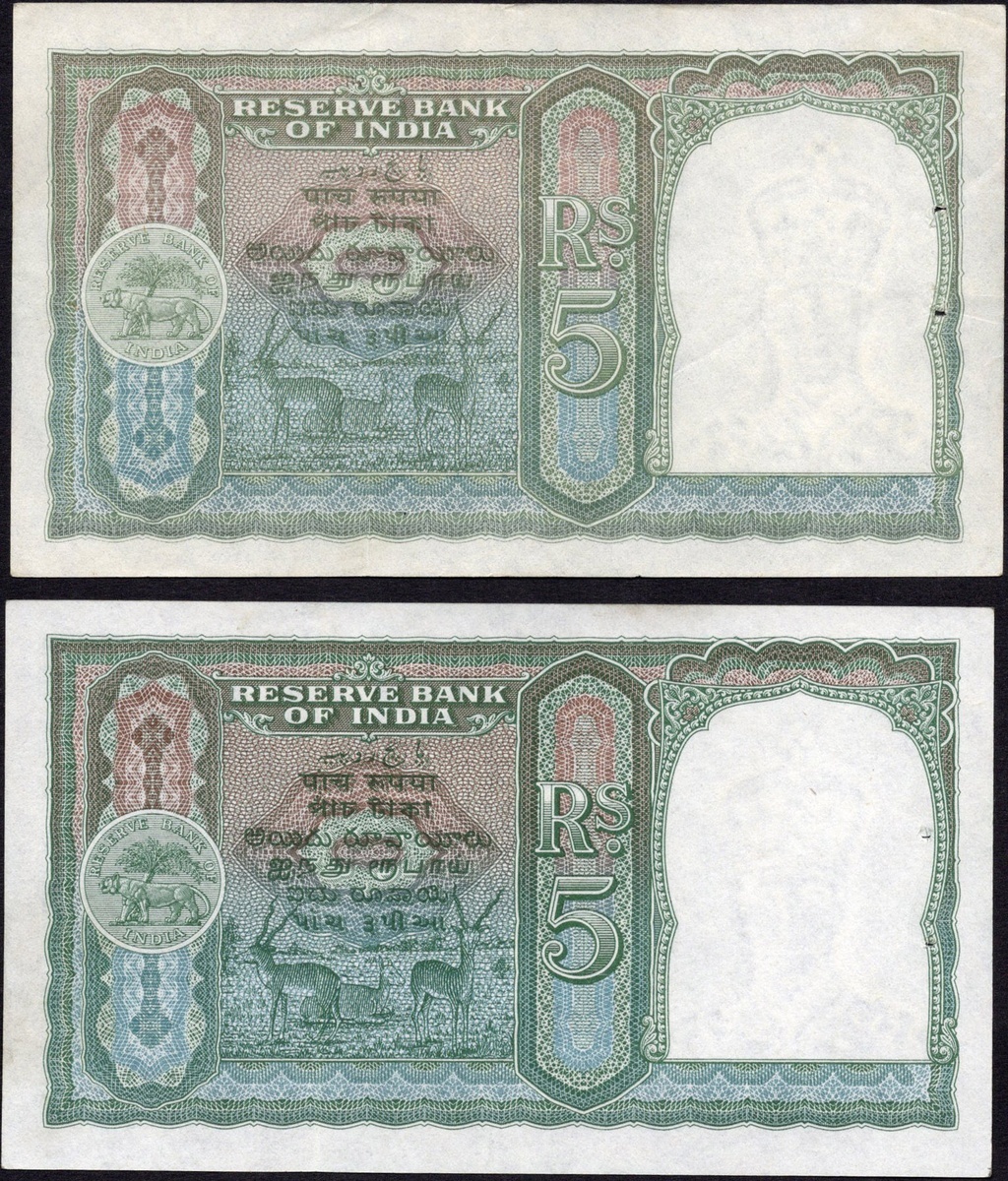 India. British Administration. Reserve Bank of India. Varietal pair of 5 Rupees. 1943 issue. P-23a, b. Black serial No. C/31 099691; and red serial No. D/68 832099. George VI facing at right. The first Uncirculated, the latter Extremely Fine, both with staplehole. [2]