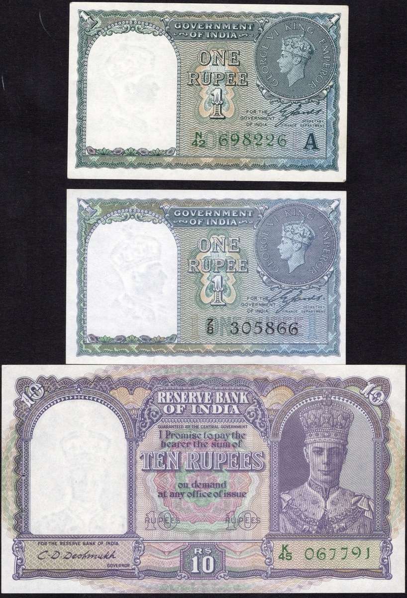 India. British Administration. Reserve Bank of India. 10 Rupees. ND (1943). P-24. No. K/45 067791. Purple and multicolor. Facing portrait of George VI at right; Dhow on back. Staple hole at left. EF-AU; also. Government of India. 1 Rupee (2). P-25a, d. The latter with stapleholes at left. AU-Unc. [3]