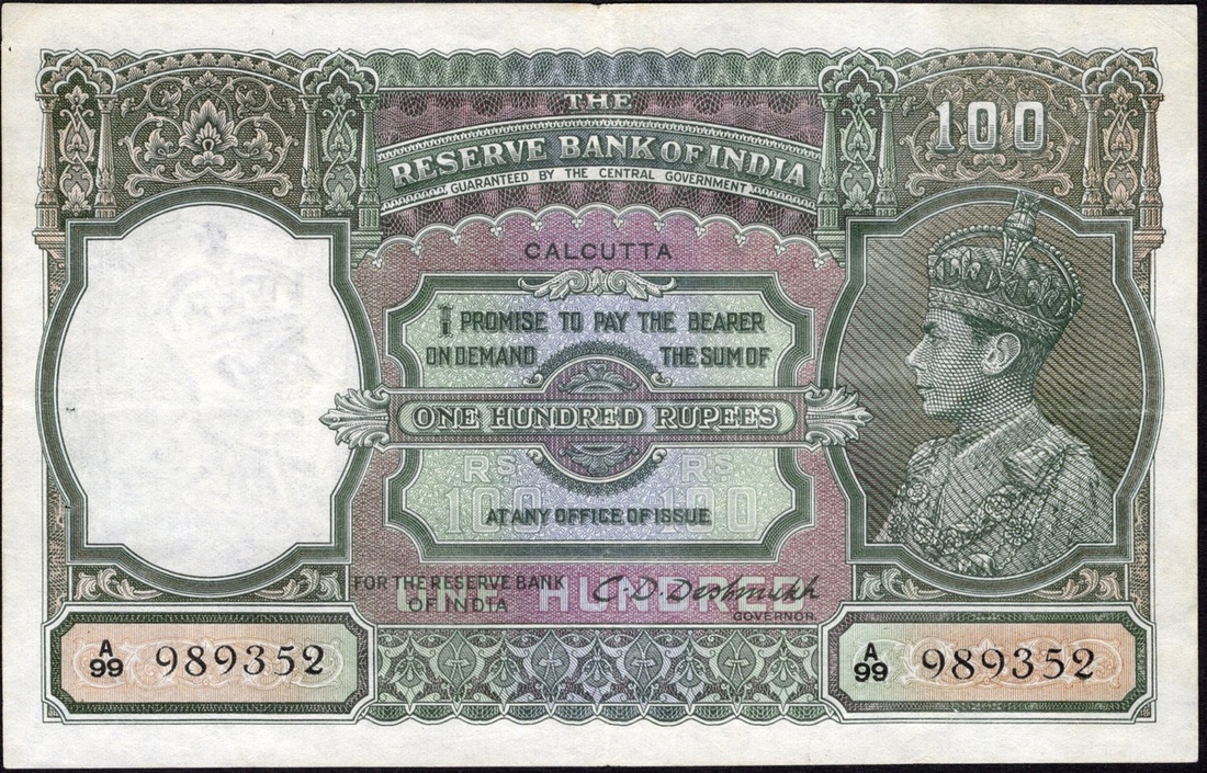 India. British Administration. Reserve Bank of India. 100 Rupees. Calcutta, ND (1937). P-20e. No. A/99 989352. Signed: C.D. Deshmukh, wmk: profile. Dark green and lilac. George VI portrait at right; Tiger head back center. Very Fine.