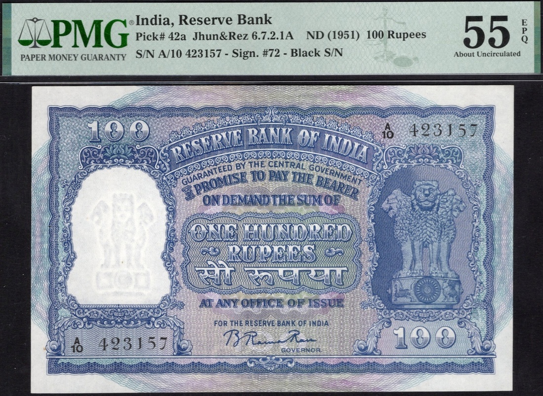 India. Republic. Reserve Bank. 100 Rupees. ND (1951). P-42a, J&R 6.7.2.1A. No. A/10 423157. Signed: B Rama Rau. Purplish-blue on multicolor. Asoka column at right; Pair of elephants on back, bank emblem below. PMG About Uncirculated 55 EPQ, staple holes at issue.