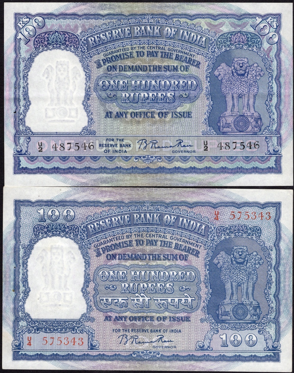 India. Republic. Reserve Bank of India. Varietal pair of 100 Rupee notes. ND. P-42a, b. Black serial No. U/2 487546; and red serial No. U/4 575343. Signed: B. Rama Rau (1949-1957). Purplish-blue on multicolor. Asoka column at right; Two elephants back center. Extremely Fine, stapleholes. [2]