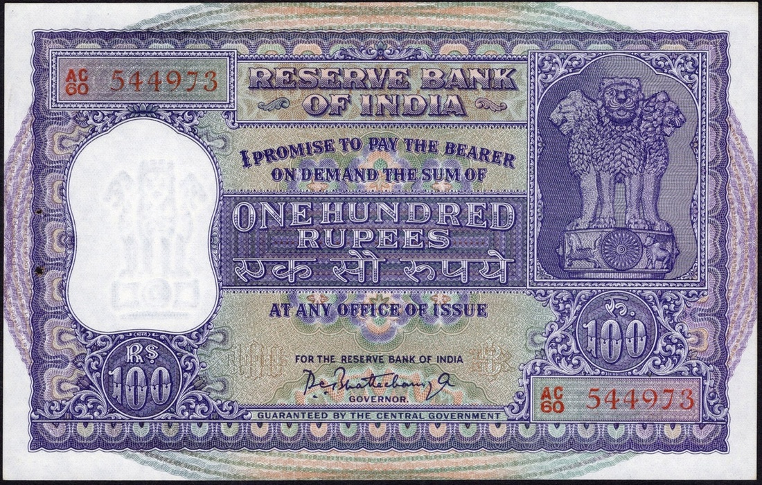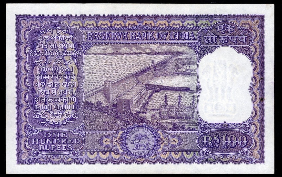 India. Republic. Reserve Bank of India. 100 Rupees. ND. P-45. No. AC/60 544973. Signed: P.C. Bhattacharyya. Violet and multicolor. Asoka column at right; Dam back center. Uncirculated, stapleholes.
