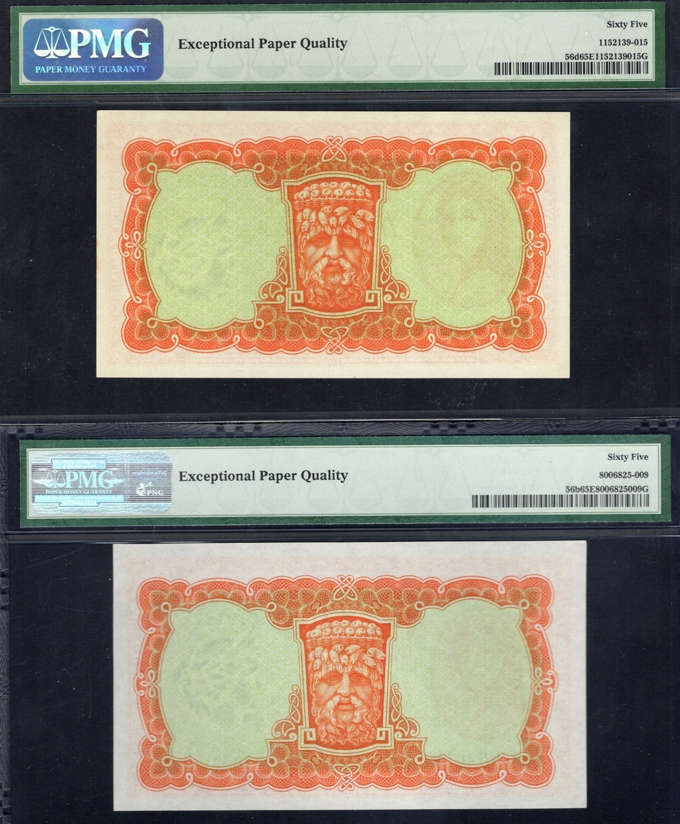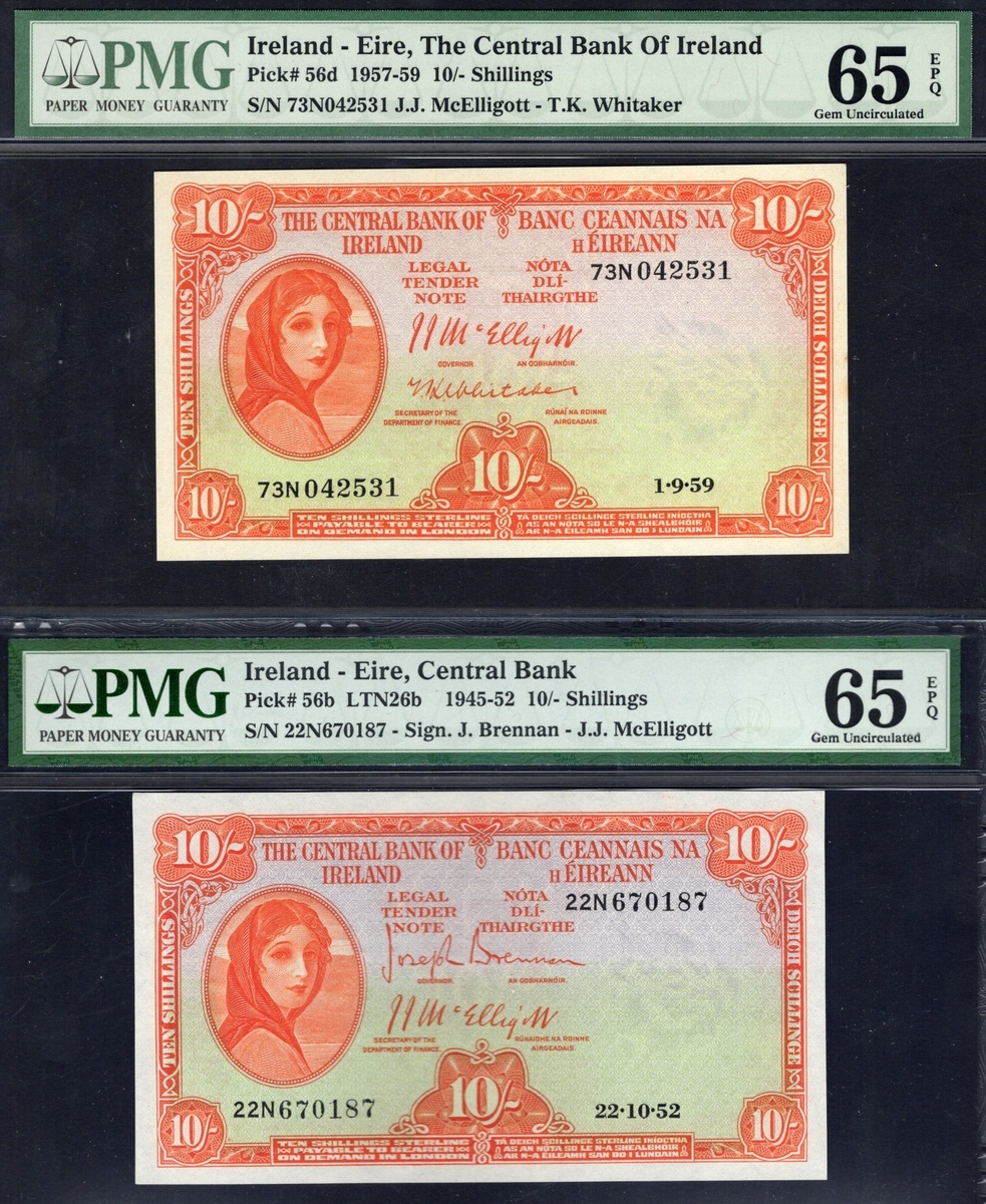 Ireland. Banc Ceannais na hÉireann - Central Bank of Ireland. PMG-graded pair of 10 Shilling notes. 22 October 1952 and 1st September 1959. P-56b2, d. Lady Lavery at left; rivergod on back. Both PMG Gem Uncirculated 65 EPQ. [2]
