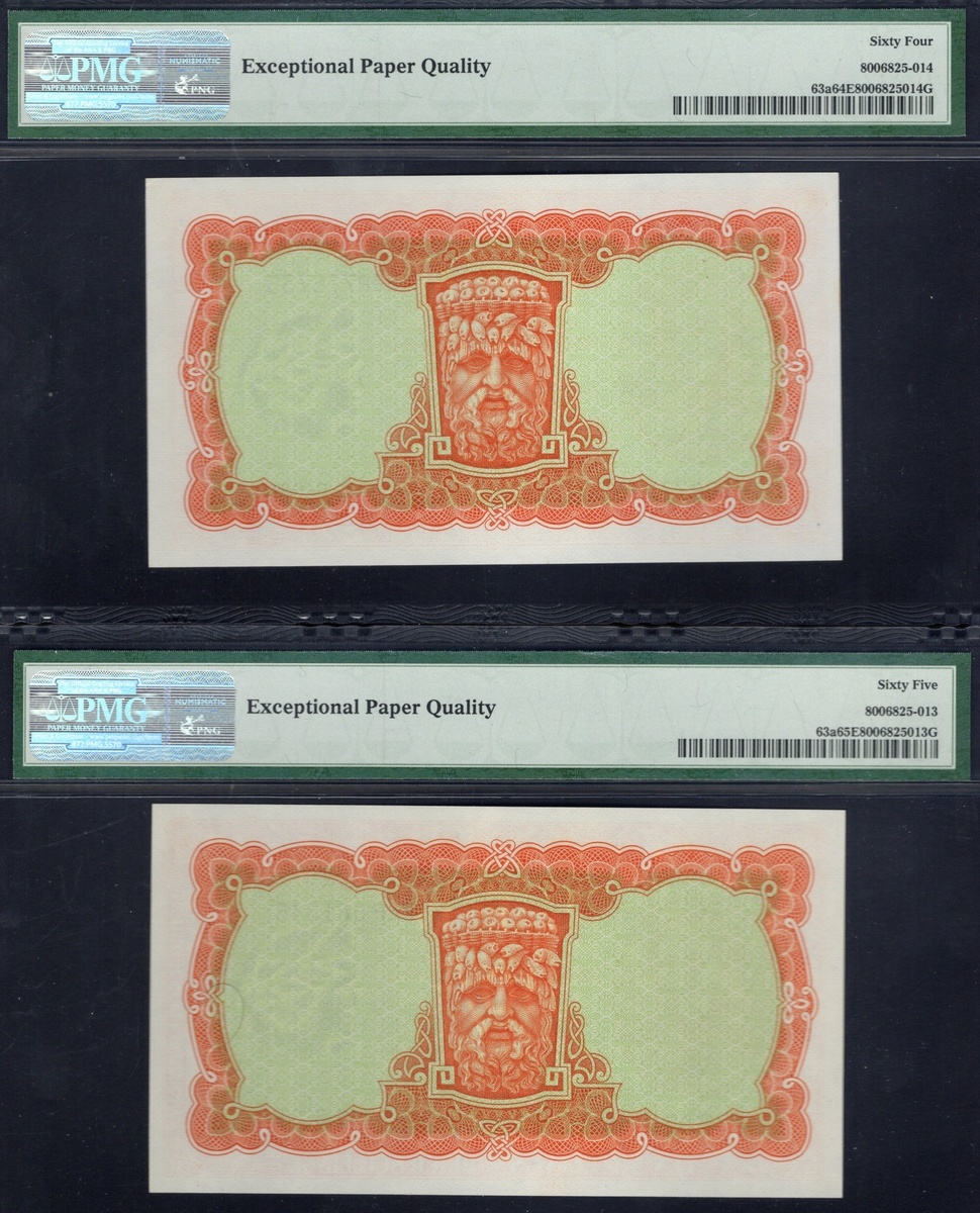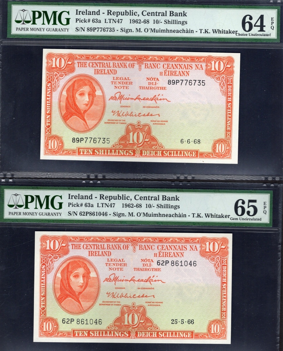 Ireland. Banc Ceannais na hÉireann - Central Bank of Ireland. PMG-graded pair of 10 Shilling notes. 25 May 1966, and 6 June 1968. P-63a. Lady Lavery at left; rivergod center back. PMG Gem Uncirculated 65 EPQ and Choice Uncirculated 64 EPQ. [2]