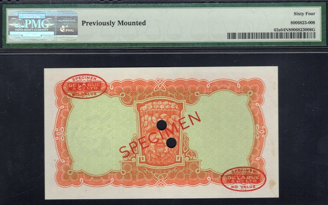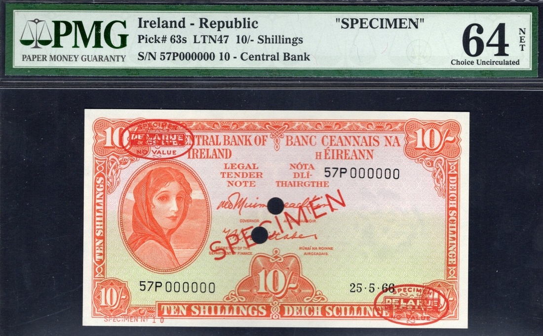 Ireland. Banc Ceannais na hÉireann - Central Bank of Ireland. Specimen 10 Shillings. 25 June 1966. P-63s. No. 57P 000000 10. Lady Lavery at left; rivergod on back. Diagonal red SPECIMEN and two De la Rue stamps front and back, two punches. PMG Choice Uncirculated 64 Net, previously mounted.