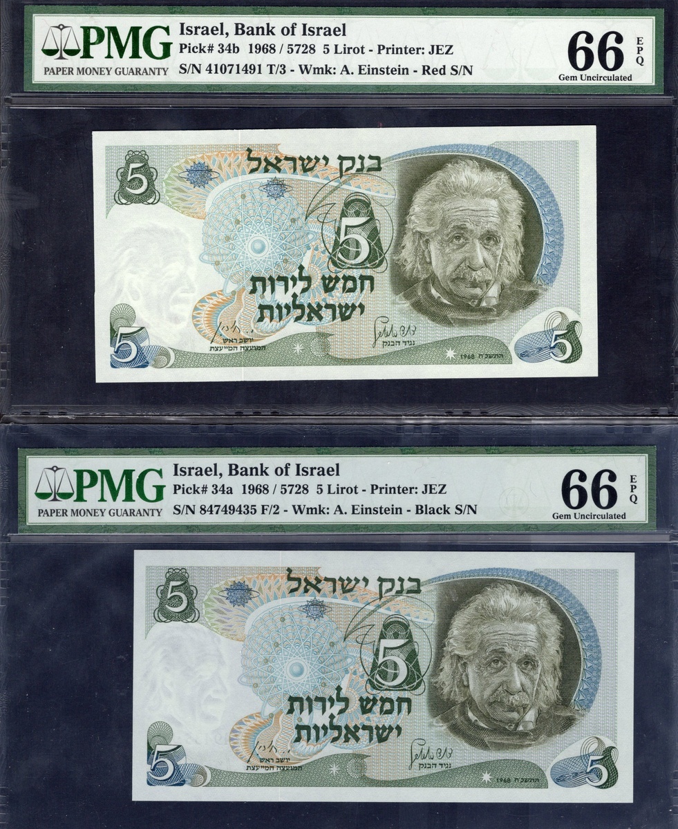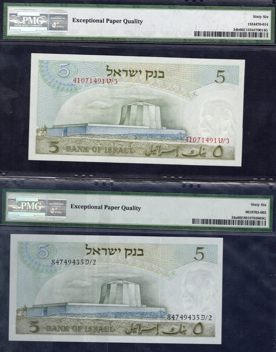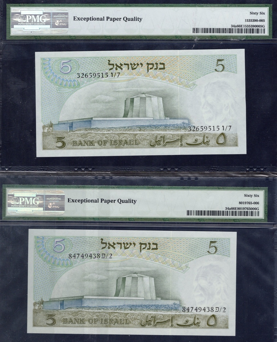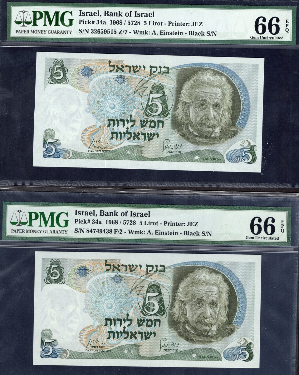 Israel. Bank of Israel. Quintet of PMG-graded 5 Lirot. 1968. P-34a (4), b. Einstein at right. One Gem Uncirculated 66 EPQ, the rest Gem Uncirculated 67 EPQ. [5]