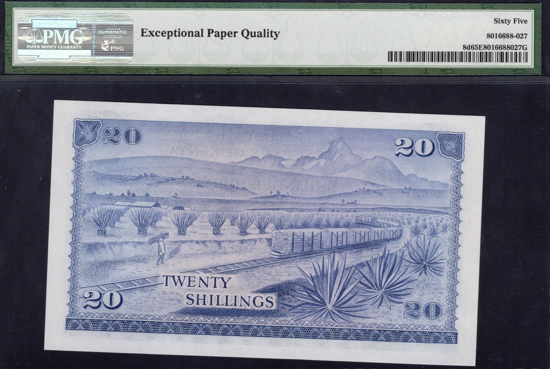 Kenya. Central Bank of Kenya. 20 Shillings. 1st July 1973. P-8d. No. A/74 126229. Blue on multicolor. Mzee Jomo Kenyatta at left; Train with a cargo of sisal passing field on back. PMG Gem Uncirculated 65 EPQ.