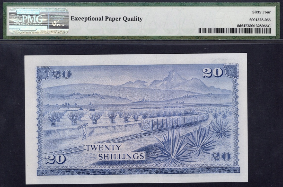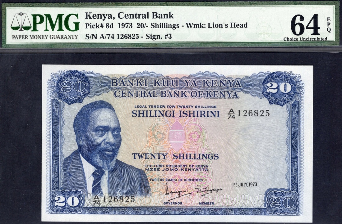 Kenya. Central Bank of Kenya. 20 Shillings. 1st July 1973. P-8d. No. A/74 126825. Blue on multicolor. Mzee Jomo Kenyatta at left; Train with a cargo of sisal passing field on back. PMG Choice Uncirculated 64 EPQ.