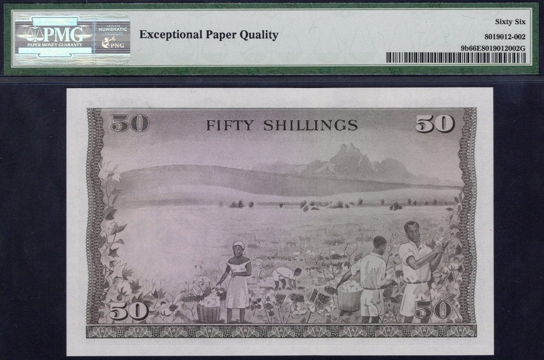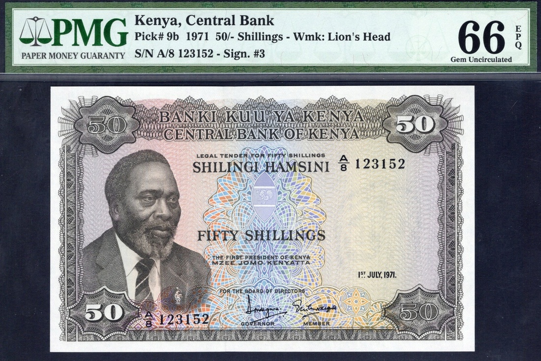 Kenya. Central Bank of Kenya. 50 Shillings. 1st July 1971. P-9b. No. A/8 123152. Dark brown on multicolor. Mzee Jomo Kenyatta at left; Cotton being picked mellow Mt Kenya on back. PMG Gem Uncirculated 66 EPQ.