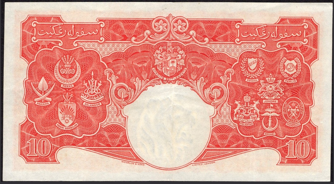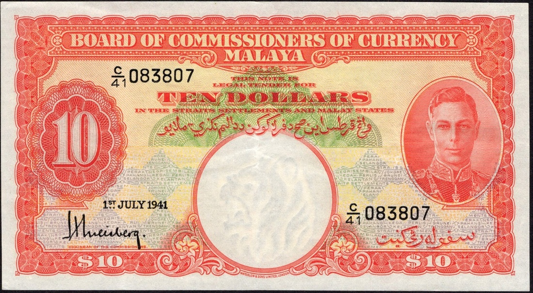 Malaya. Board of Commissioners of Currency. 10 Dollars. 1 July 1941. P-13. No. C/41 083807. Red and multicolor. George VI portrait at right; Malay State Arms on back. Good Very Fine.