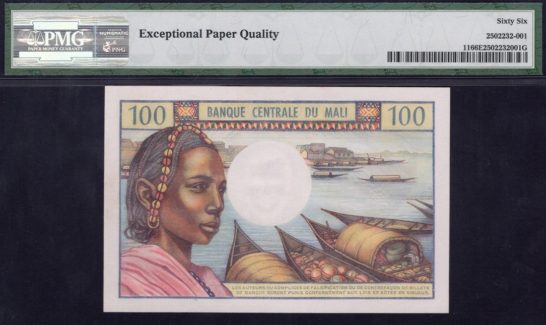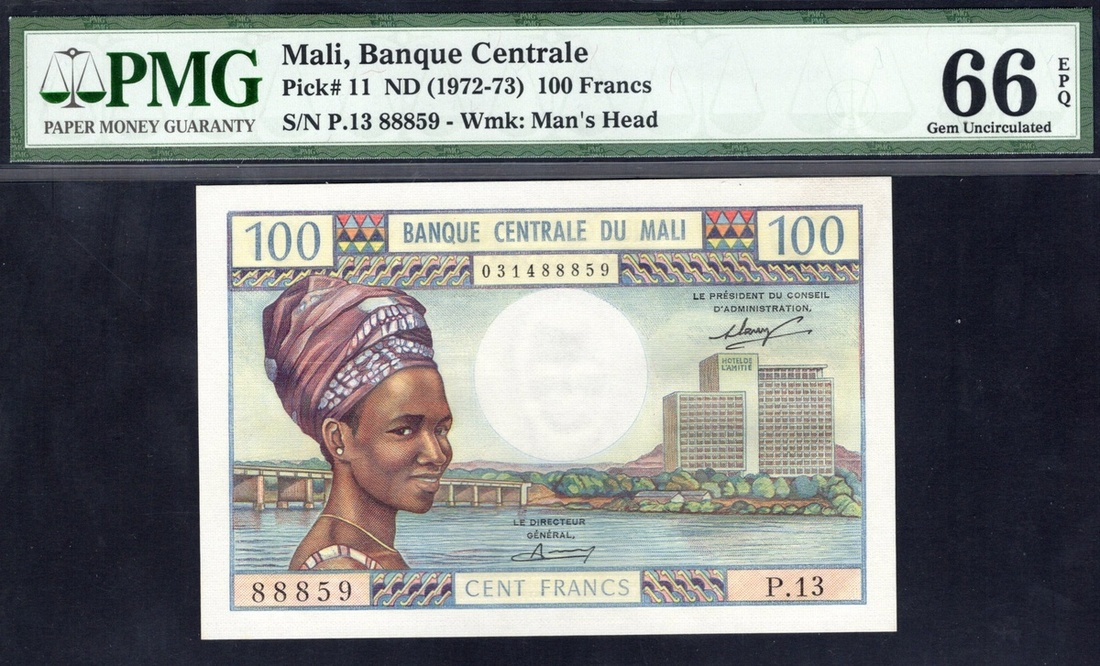 Mali. Banque Centrale du Mali. 100 Francs ND (1972-1973). P-11. No. P.13 88859. Brown and multicolor. Woman at left, hotel right; Woman at left, pirogues right on back. PMG Gem Uncirculated 66 EPQ.