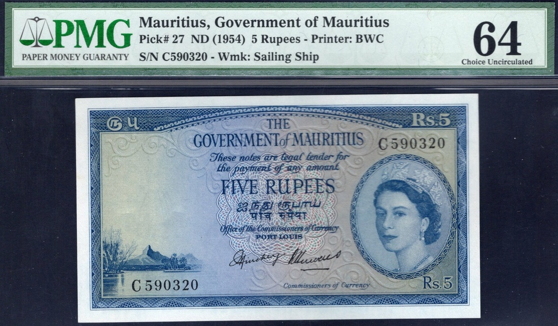 Mauritius. Government of Mauritius. 5 Rupees. ND (1954). P-27. No. C590320. Blue on multicolor. Mountain scene lower left, Elizabeth II right; Arms on back. PMG Choice Uncirculated 64.