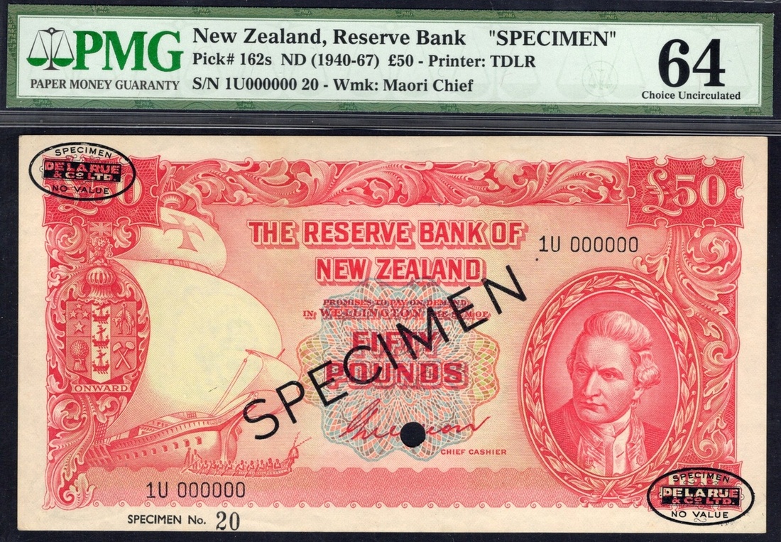 New Zealand. Reserve Bank of New Zealand. Specimen 50 Pounds. ND (1940-67). P-162s. No. 1U000000 20. Red on multicolor. Captain Cook lower right, ship at left; Mt. Egmont, dairy farm and bird on back. Diagonal black SPECIMEN and two De la Rue stamps front and back, single punch. PMG Choice Uncirculated 64.