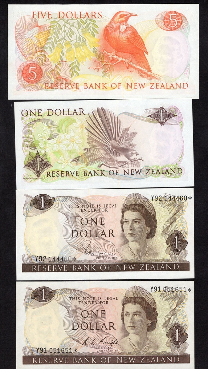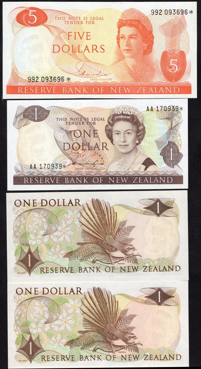 New Zealand. Reserve Bank of New Zealand. Quintet of Star (*) Replacement notes. 1 Dollar. P-163c, d, 169a; and Dollars. 165d (2). Elizabeth II at right. Crisp Uncirculated. [5]
