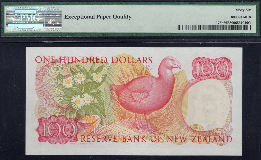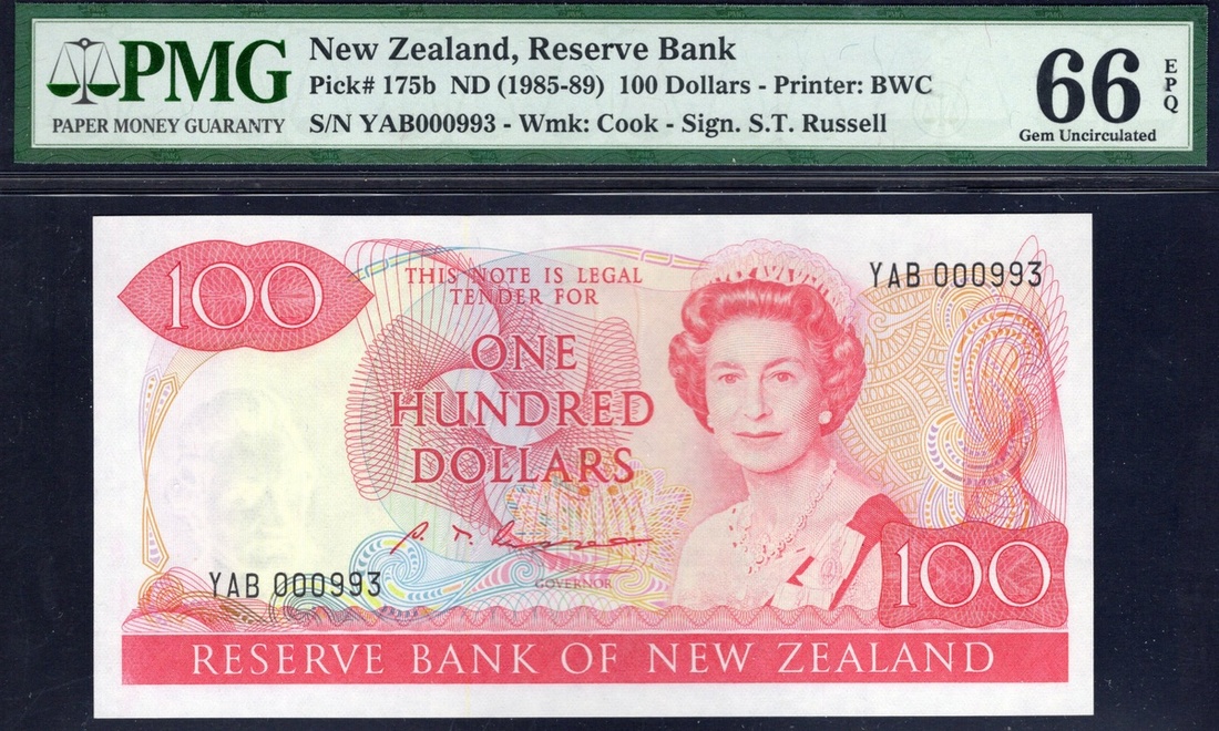 New Zealand. Reserve Bank of New Zealand. 100 Pounds. ND (1985-1989). P-175b. No. YAB 000993. Signed: S.T. Russell. Red on multicolor. Mature portrait of Elizabeth II at right; Takahe center back. PMG Gem Uncirculated 66 EPQ.