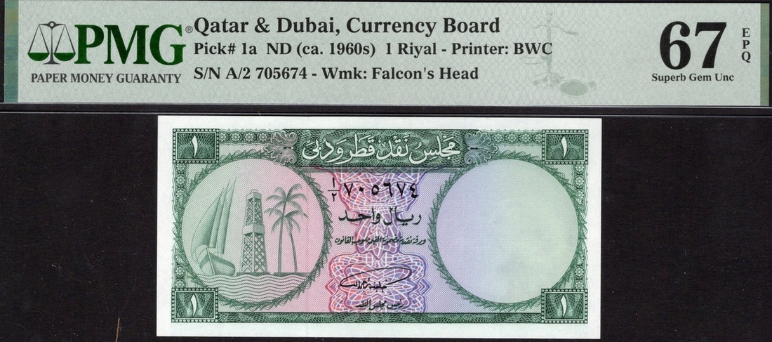 Qatar & Dubai. Currency Board. 1 Riyal. ND (1960s). P-1a. No. A/2 705674. Dark green on multicolor. Dhow, derrick and palm tree. PMG Superb Gem 67 EPQ.