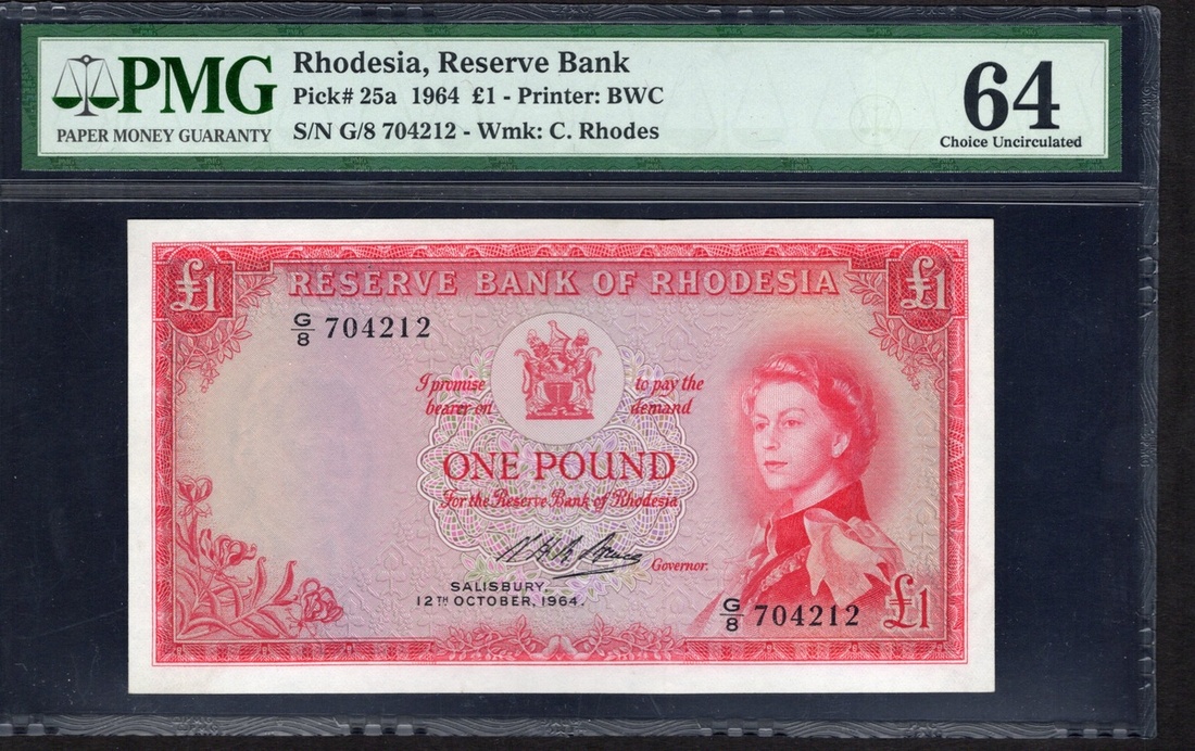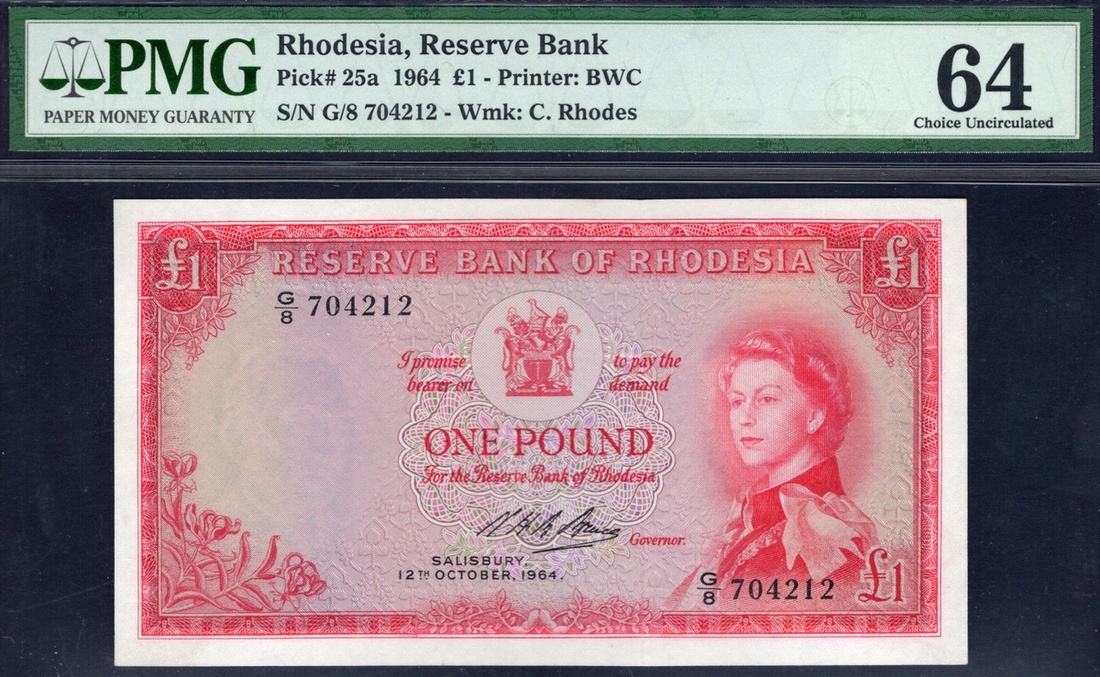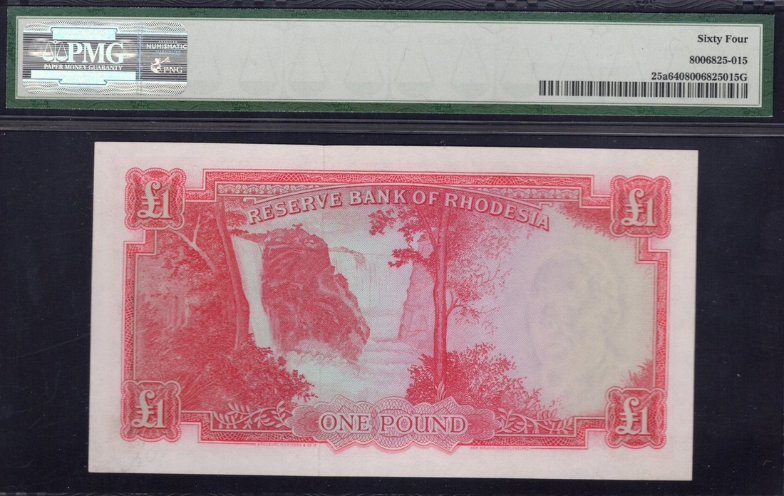 Rhodesia. Reserve Bank of Rhodesia. 1 Pound. 12th October 1964. P-25a. No. G/8 704212. Red on multicolor. Elizabeth II at right; Victoria Falls on back. PMG Choice Uncirculated 64.