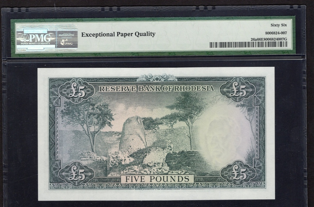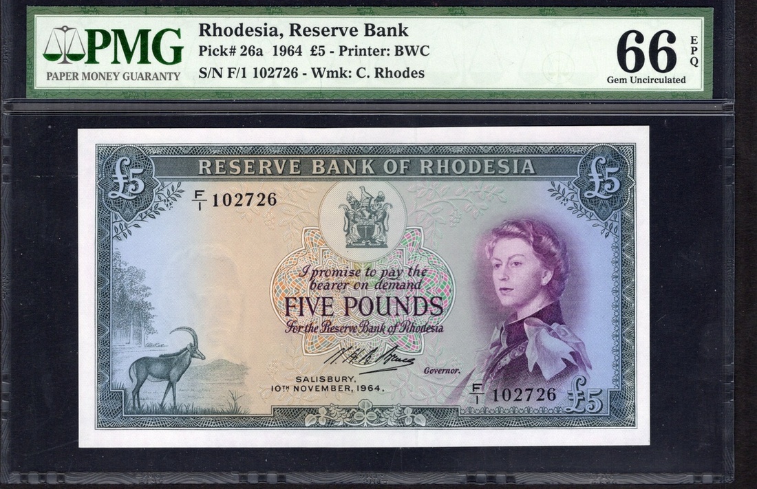 Rhodesia. Reserve Bank of Rhodesia. 5 Pounds. 10th November 1964. P-26a. No. F/I 102726. Blue-green on multicolor. Elizabeth II at right, sable lower left; Zimbabwe ruins on back. PMG Gem Uncirculated 66 EPQ.