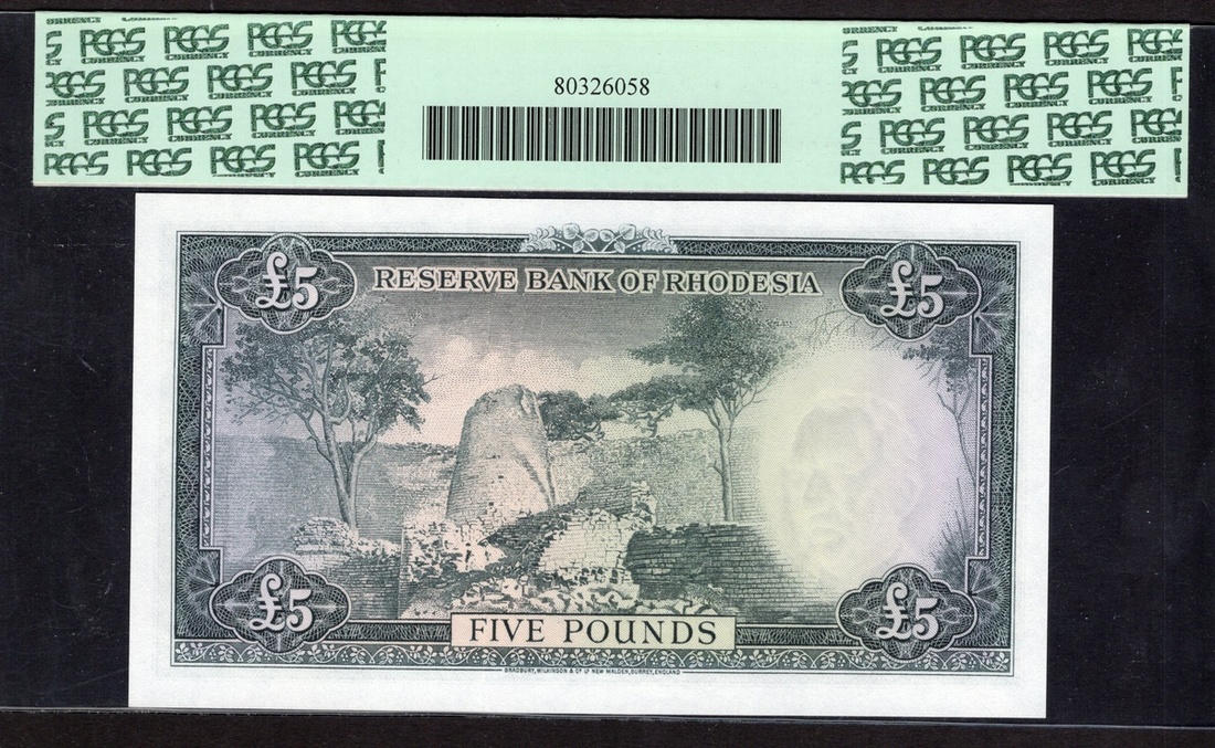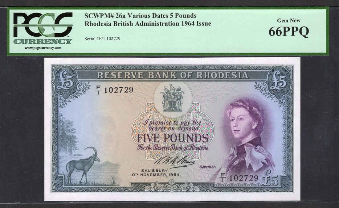 Rhodesia. Reserve Bank of Rhodesia. 5 Pounds. 10th November 1964. P-26a. No. F/I 102729. Blue-green on multicolor. Elizabeth II at right, sable lower left; Zimbabwe ruins on back. PCGS Gem New 66 PPQ.