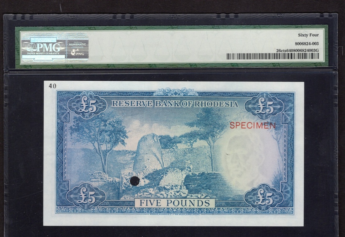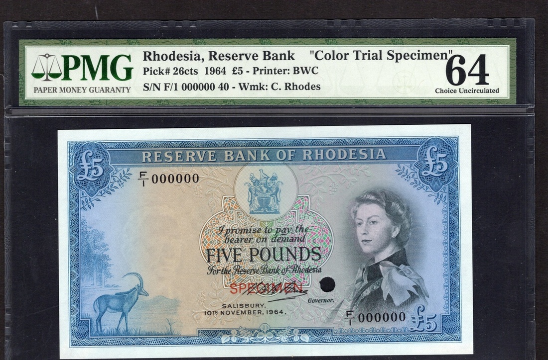 Rhodesia. Reserve Bank of Rhodesia. Color Trial Specimen 5 Pounds. 10th November 1964. P-26cts. No. F/I 000000 40. Blue on multicolor. Elizabeth II at right, sable lower left; Zimbabwe ruins on back. PMG Choice Uncirculated 64.