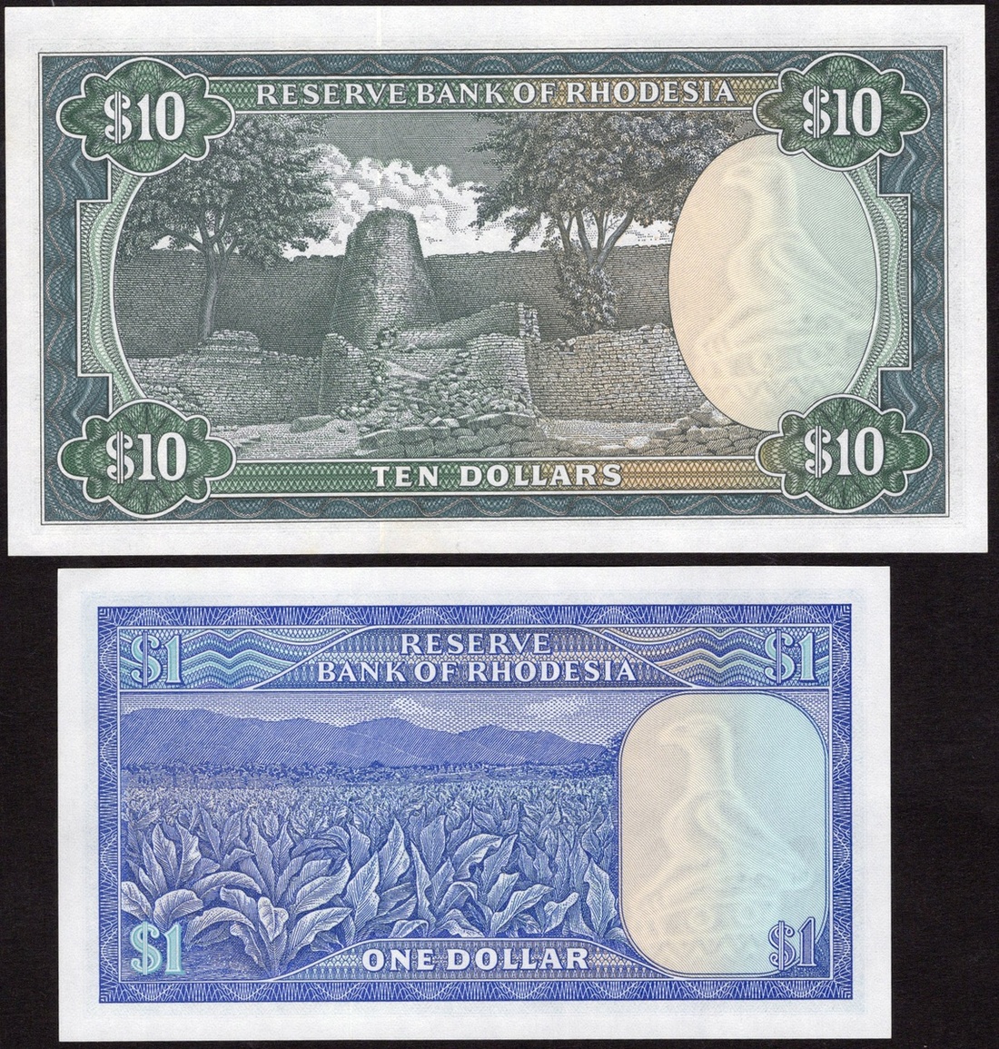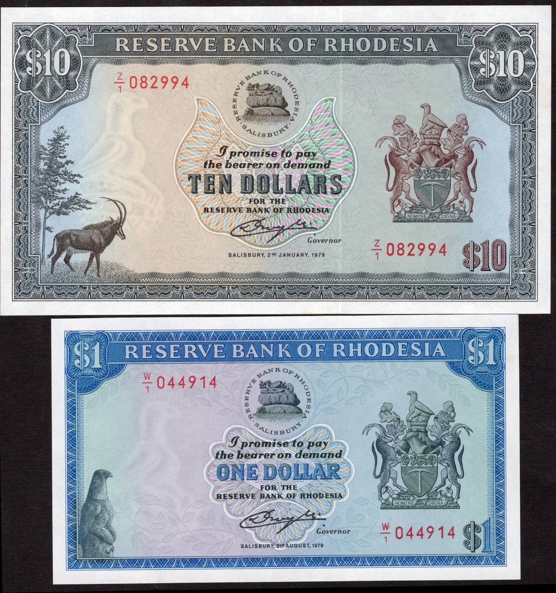 Rhodesia. Reserve Bank of Rhodesia. Pair of Replacement notes. 1 Dollar. 2nd August 1979. P-38a*. No. W/1 044914. Stone Zimbabwe bird lower left; and 10 Dollars. 2nd January 1979. P-41a*. No. Z/1 082994. Sable lower left. Crisp Uncirculated. [2]