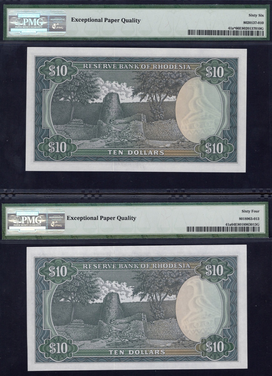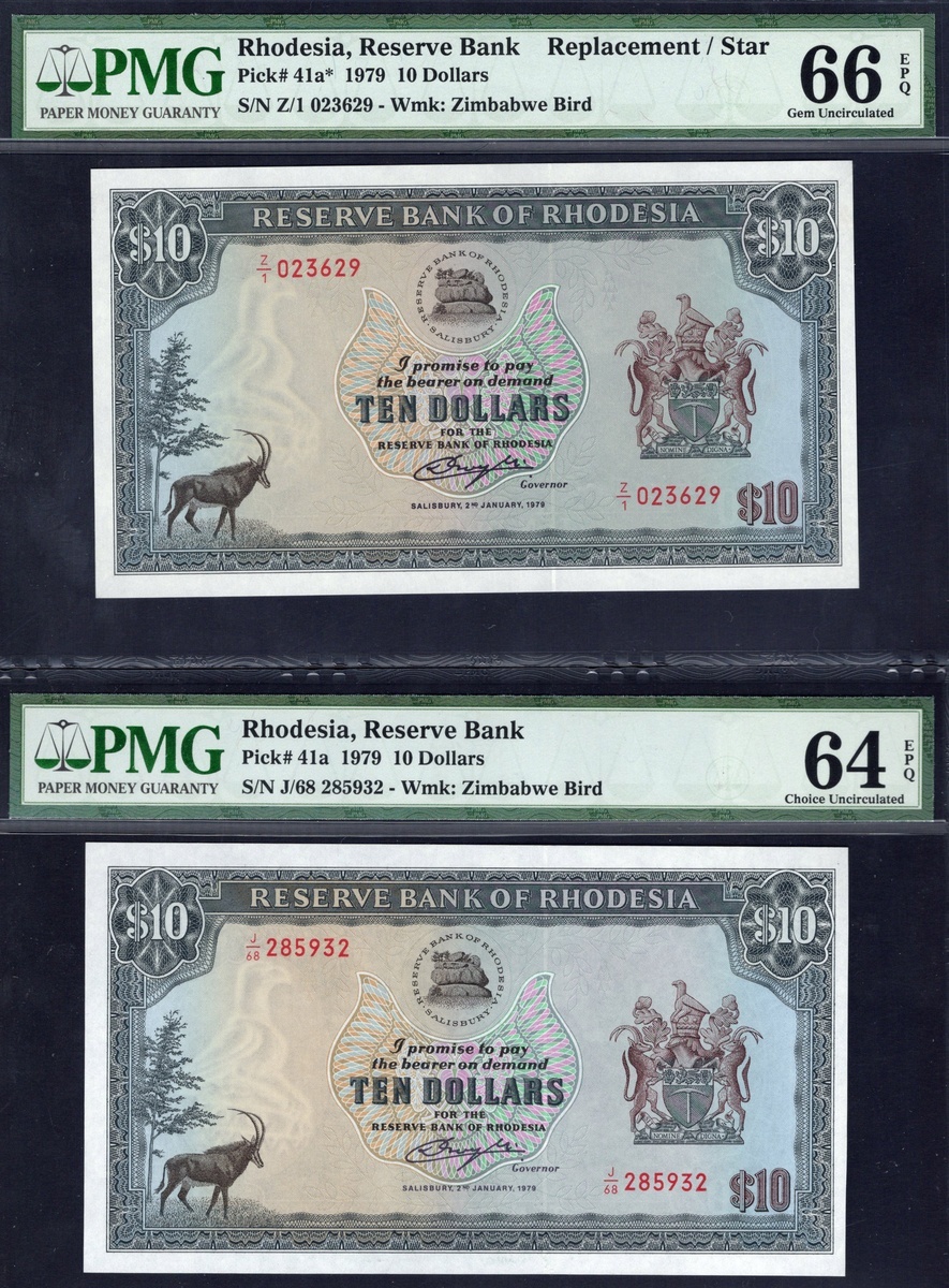 Rhodesia. Reserve Bank of Rhodesia. Varietal pair of 10 Dollars. 2nd January 1979. P-41a, 41a*. Nos. J/68 285932, and replacement note: Z/1 023629. Black on blue-green and multicolor. Wmk: Zimbabwe bird. Sable at lower left, Arms right, bank logo upper center; Zimbabwe ruins on back. PMG Choice Uncirculated 64 EPQ and Gem Uncirculated 66 EPQ. [2]