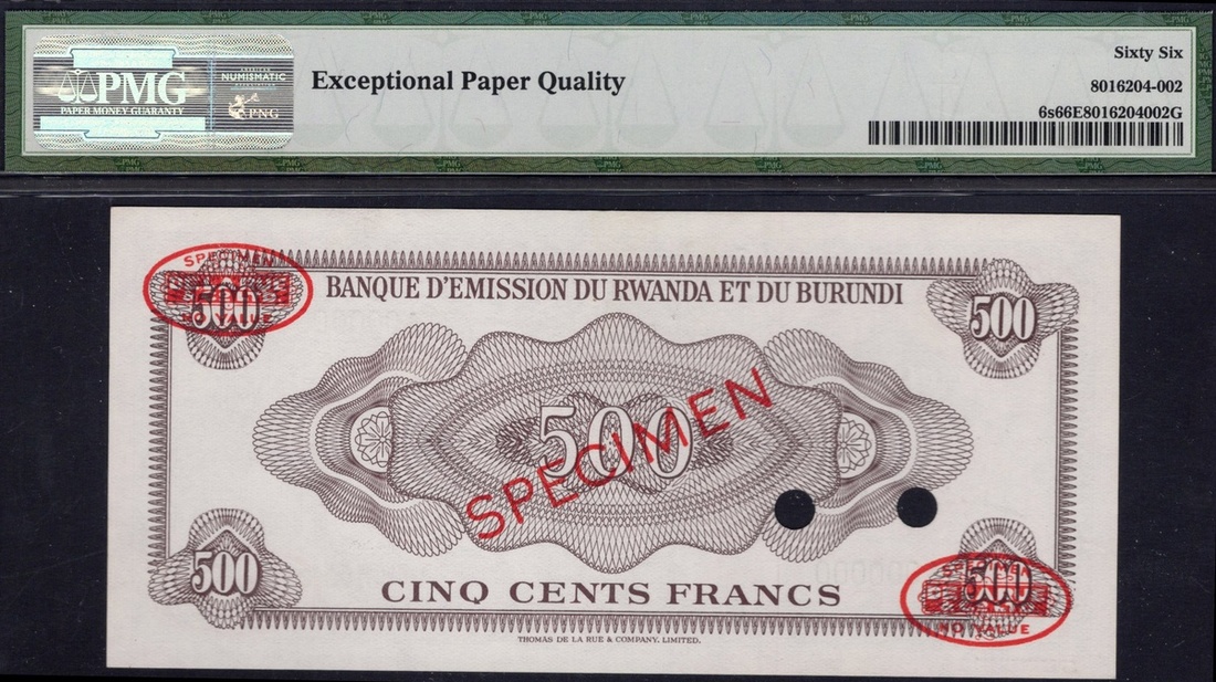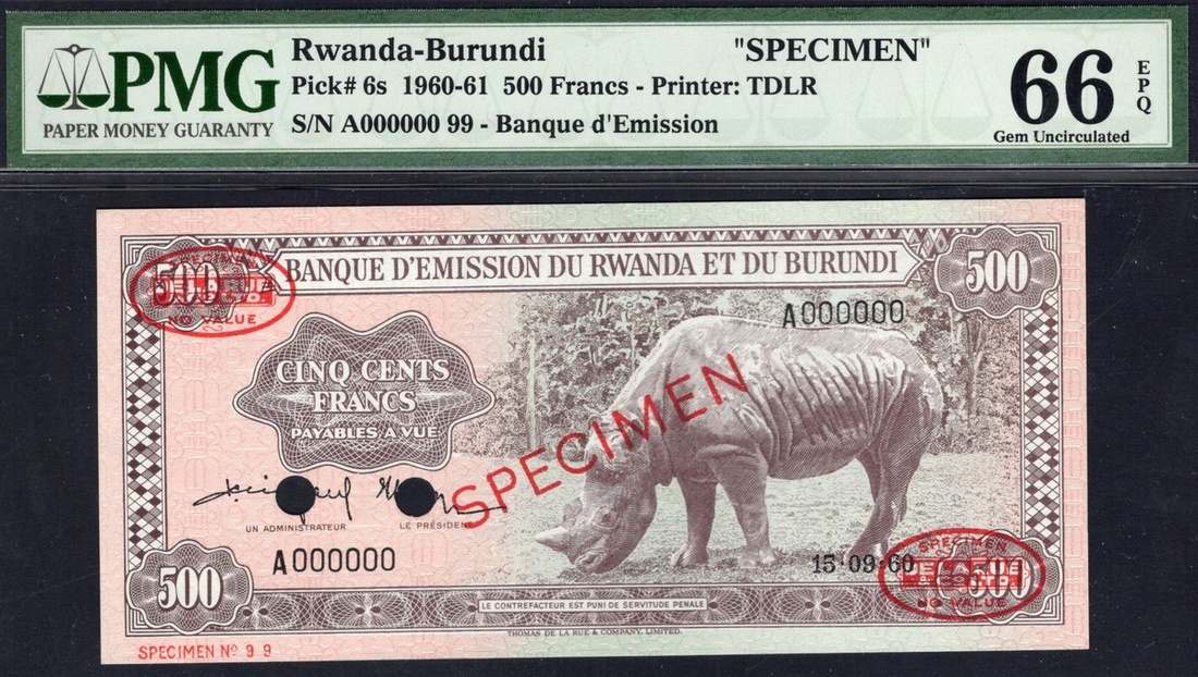 Rwanda-Burundi. Banque d'Emission du Rwanda et du Burundi. Specimen 500 Francs. 15 September 1960. P-6s. No. A000000 99. Lilac-brown, pale red and green. Black rhinoceros center right. Diagonal red SPECIMEN and two De la Rue seals front and back, two punches. PMG Gem Uncirculated 66 EPQ.