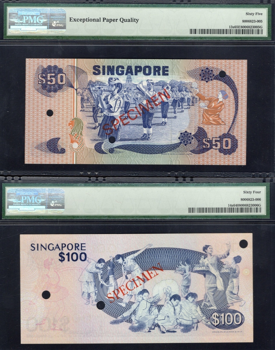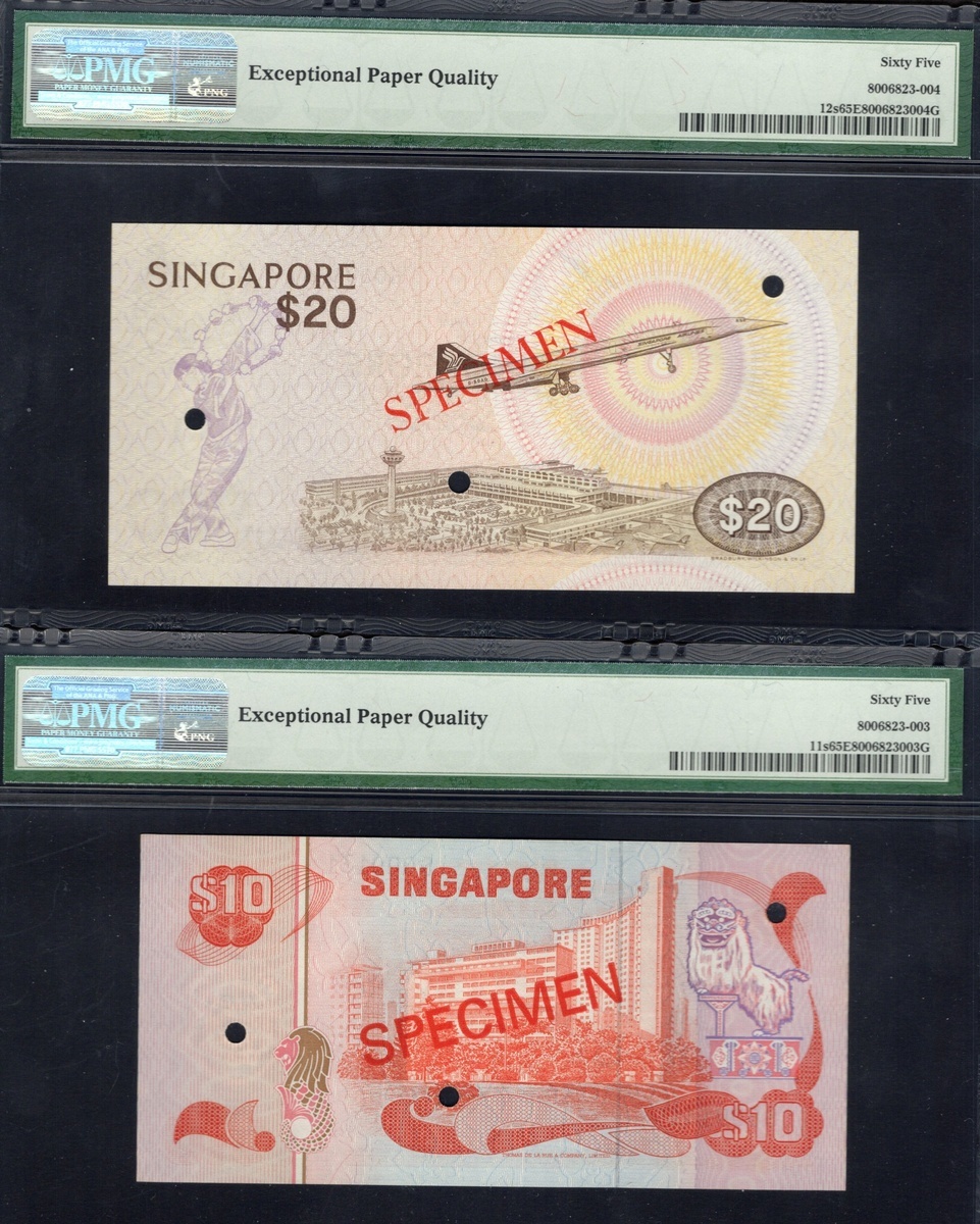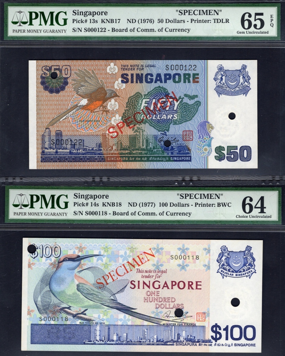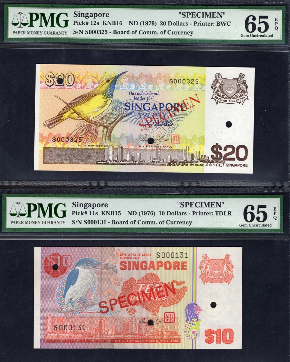 Singapore. Board of Commissioners of Currency. PMG-graded 1976-1980 series Specimen type Set. 1 Dollar, 5, 10, 20, 50 and 100 Dollars. P-9s to 14s. Avian and cityscape motifs. Diagonal red SPECIMEN, two punches, the 50 three. The first Gem Uncirculated 66 EPQ, the last Choice Uncirculated 64, the others Gem Uncirculated 65 EPQ. [6]