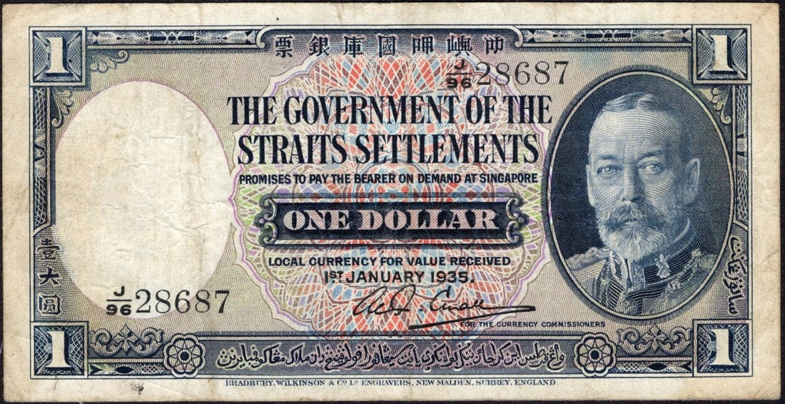 Straits Settlements. Government of the Straits Settlements. 1 Dollar. 1935. P-16b. No. J/96 28687. Dark blue on multicolor. George V portrait at right; Tiger back center, classical woman's profile at left. About Fine.