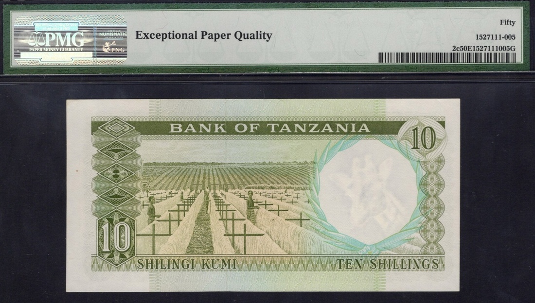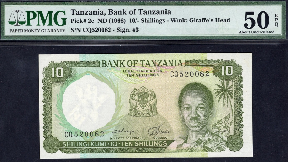 Tanzania. Bank of Tanzania. 10 Shillings. ND (1966). P-2c. No. CQ520082. Green on multicolor. Julius Nyerere at right, Arms center; Sisal drying on back. Very scarce signature variety. PMG About Uncirculated 50 EPQ.