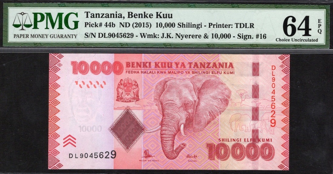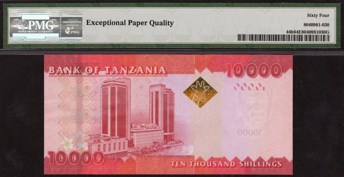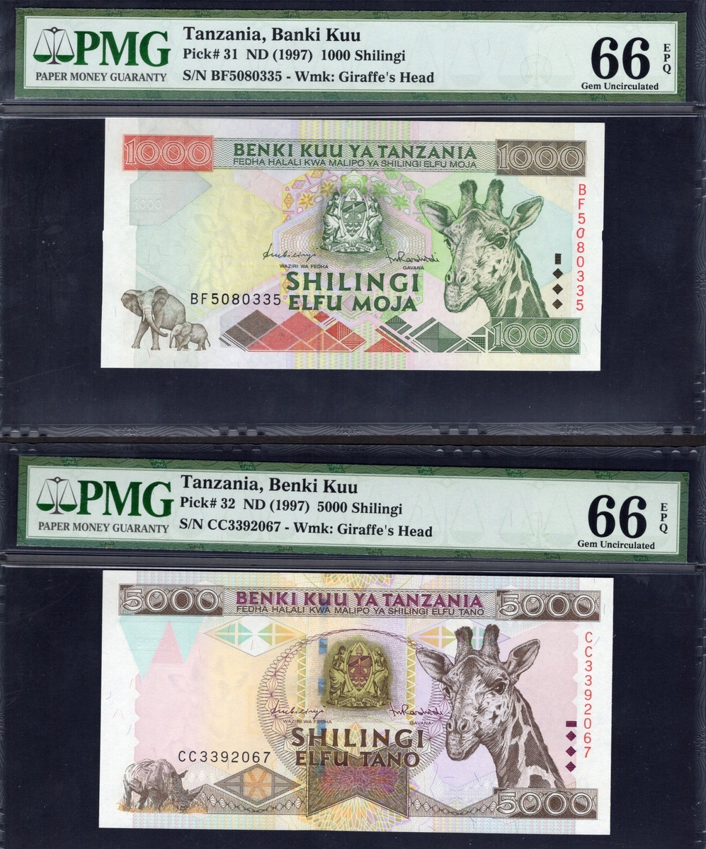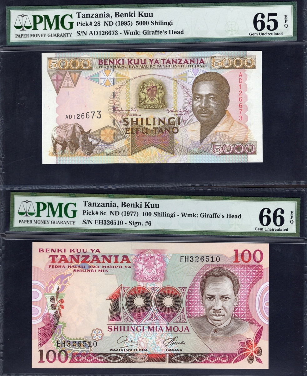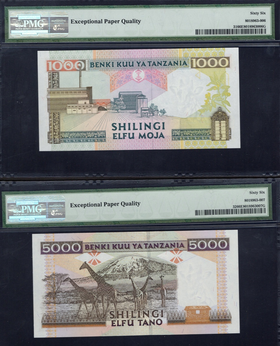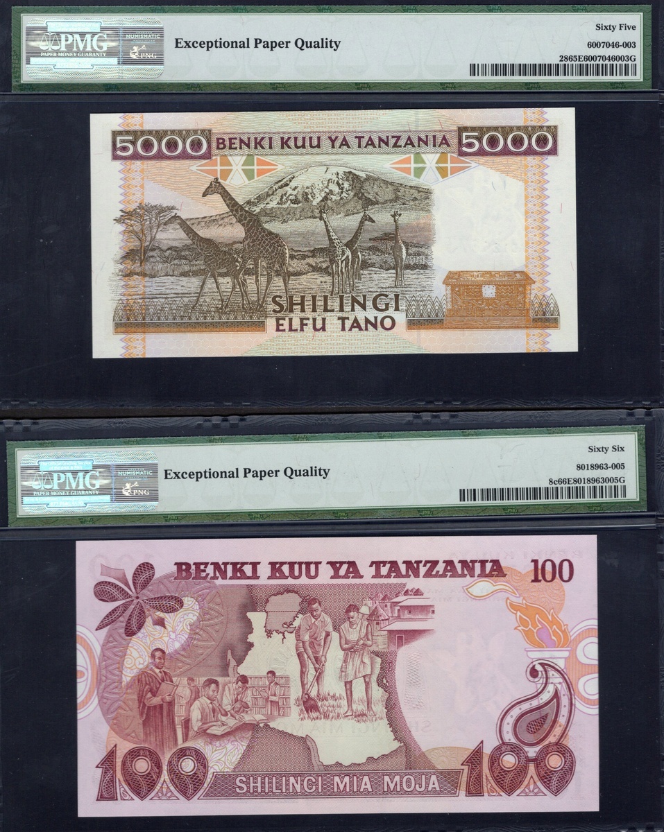 Tanzania. Benki Kuu ya Tanzania. Quintet of PMG-graded notes. 100 Shilingi. P-8c. Gem Uncirculated 66 EPQ; 5000 Shilingi. P-28. Gem Uncirculated 65 EPQ; 1000 and 5000 Shilingi. P-31, 32. Both Gem Uncirculated 66 EPQ; and 10,000 Shilingi. P-44b. [5]
