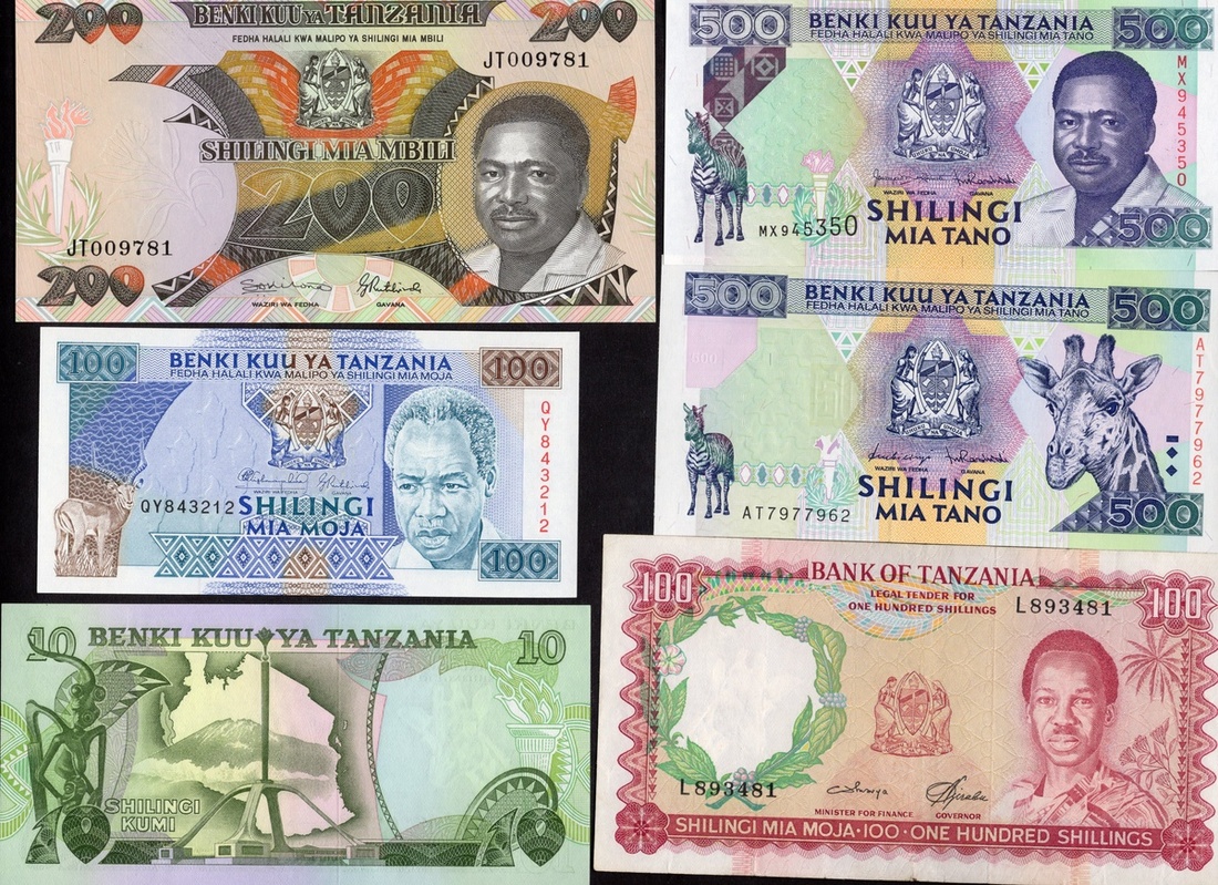 Tanzania. Bank of Tanzania-Benki Kuu ya Tanzania. Large lot of 1966-1997 notes. Includes: P-1a (3), 2a (4), 2e (10, consecutive), 5b, 6a, 6c (5), 7c, 20, 24, 25a, 26c, 30 (2). The Pick 5b 100 Shillings 1966 Very Fine, the rest generally Crisp Uncirculated.