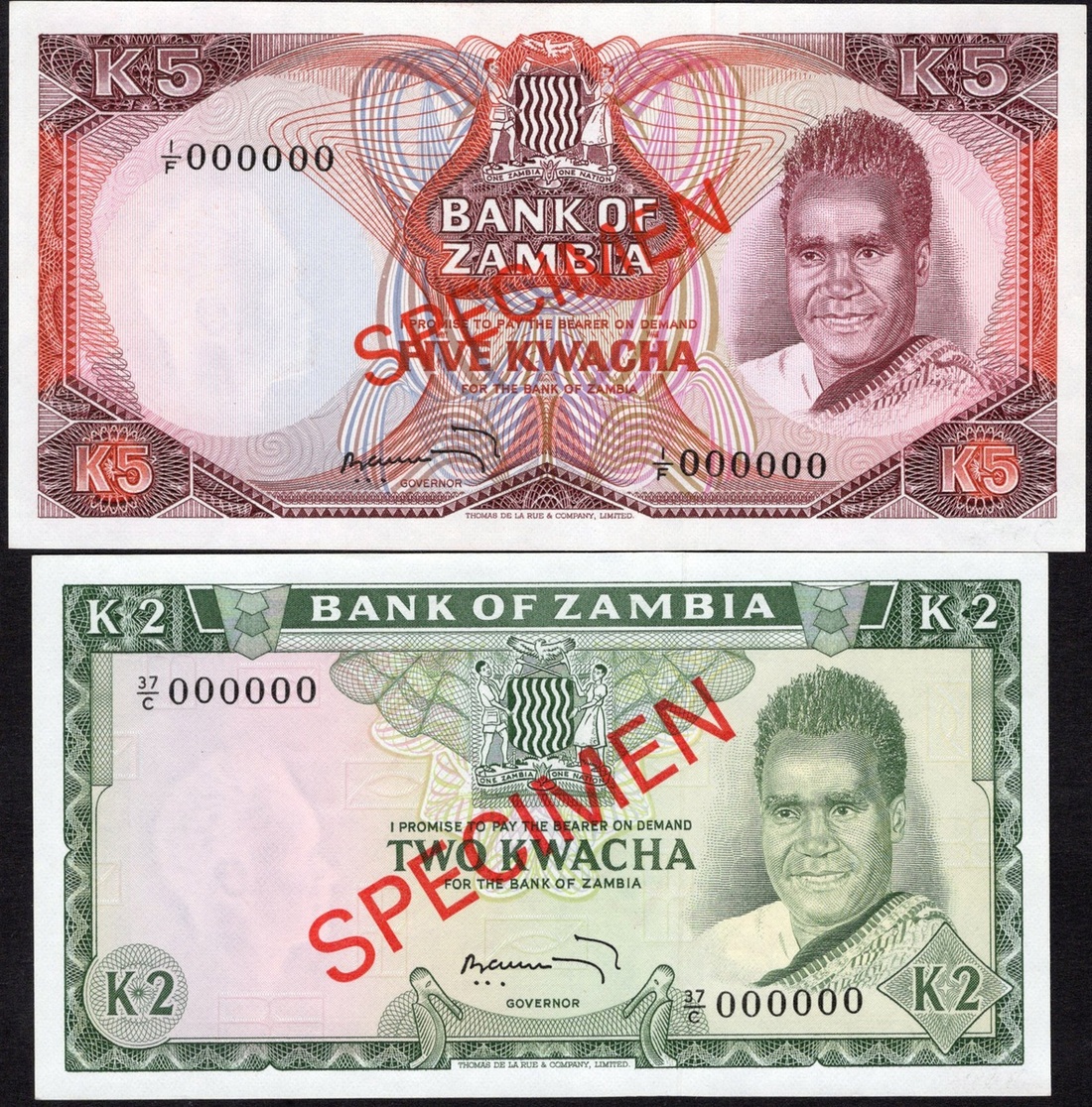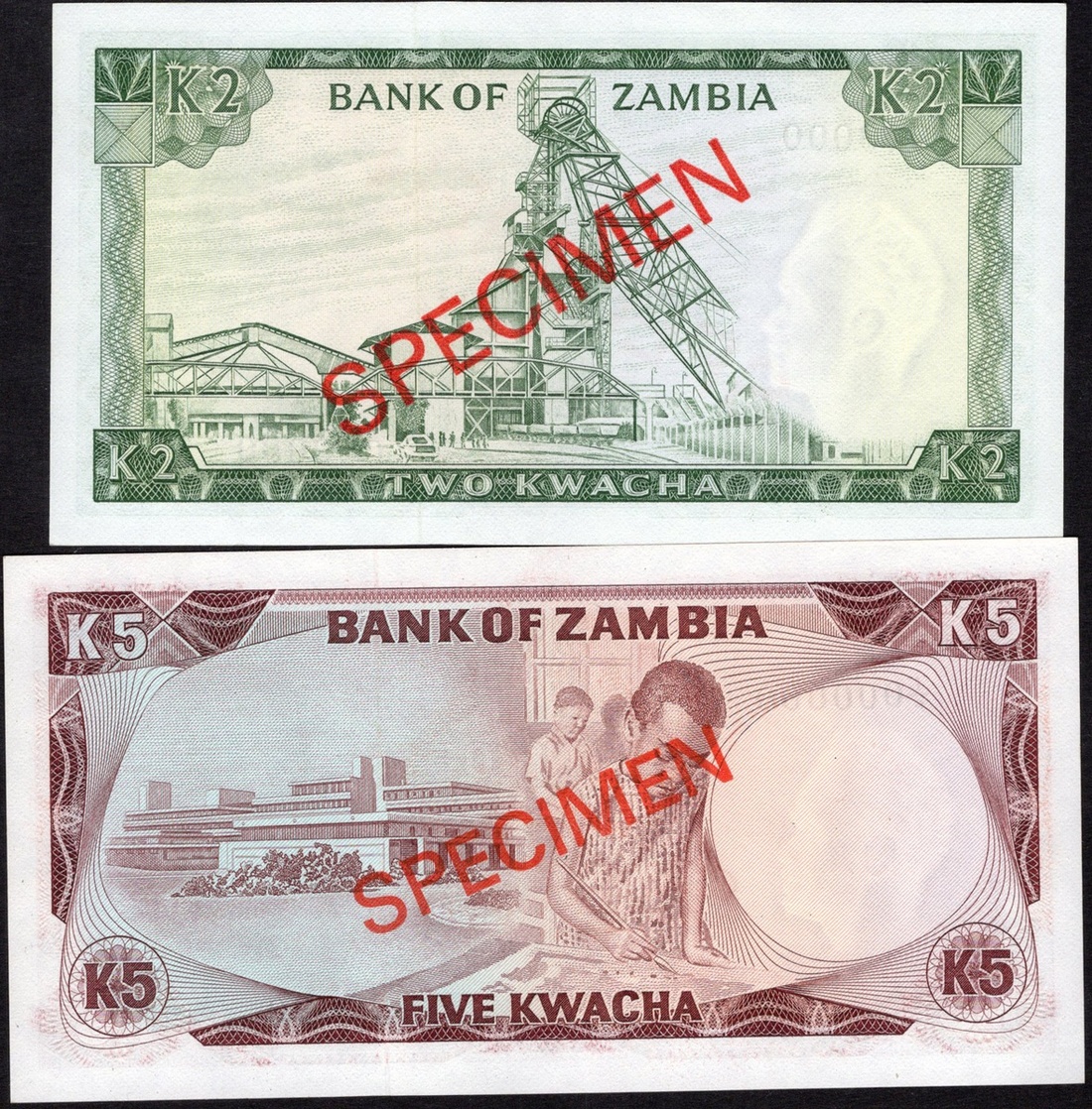 Zambia. Bank of Zambia. Pair of Specimen notes: Specimen 2 Kwacha. 1969 issue. P-11cs; and 5 Kwacha. ND (1973). P-15s. President Kaunda at right. Diagonal red SPECIMEN front and back. Crisp Uncirculated. [2]