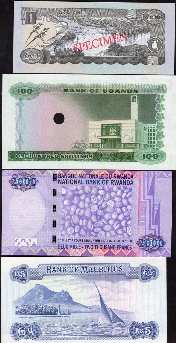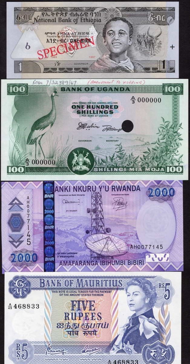 A Quintet of African Specimen notes: Ethiopia. Specimen 1 Birr. P-46s; Rwanda. Specimen 100 Francs. P-8s1, 8s2. Diagonal red, black SPECIMEN; and Uganda. Specimen 100 Shilingi. P-5s (2). One, diagonal red SPECIMEN, notations with date and number top and bottom margin; the other single punch, date and number notation top margin. Choice AU-Uncirculated; also: Mauritius. 5 Rupees. P-30c, and Rwanda. 2000 Francs. P-32. Uncirculated. [7]