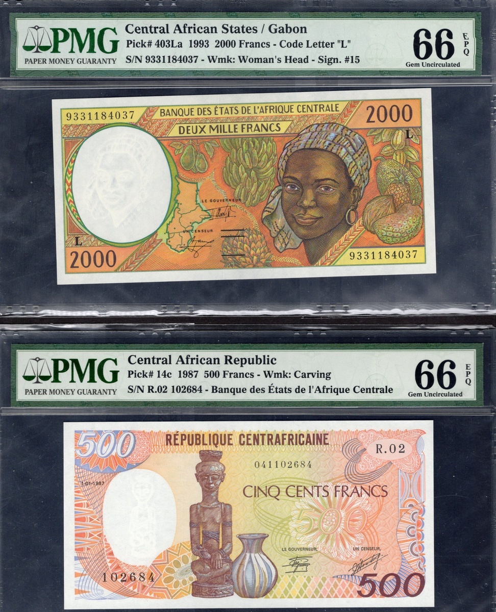 Lot of PMG-graded African banknotes. Central African Republic. 500 Francs. P-14c; Central African States. 2000 Francs. P-403La; 2000 Francs. P-108T; Comoros. 500 Francs. P-10b; Congo Democratic Republic. Specimen 50 Francs. P-97s; Djibouti. 1000 Francs. P-37d; 37e (2); Madagascar. 500 Francs. P-75b, 1000 Francs. P-76b; 2500 Francs. P-81; Sierra Leone. 1 Leone. P-5e; and Zaire. 1 Zaire. P-18b. The Central African States P-108T Superb Gem Unc 67 EPQ; Djibouti P-37d Choice Uncirculated 64; Madagascar P-81 Gem Uncirculated 65 EPQ. The others Gem Uncirculated 66 EPQ; also NPGS-graded notes: Ghana. Collector Series Specimen 1 Cedi. P-13cs1. NPGS Superb Gem Uncirculated 67 EPQ; and Rwanda. 100 Francs. P-12a. Gem Uncirculated 66 EPQ. [15]