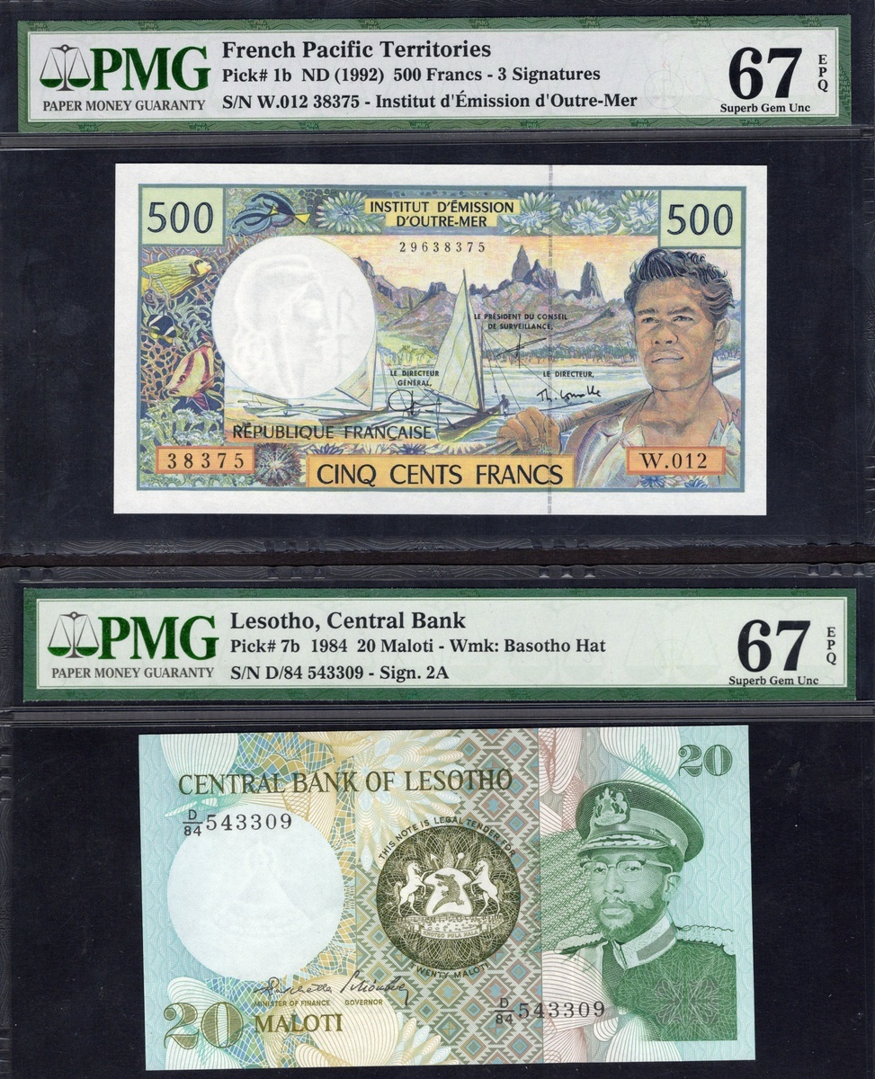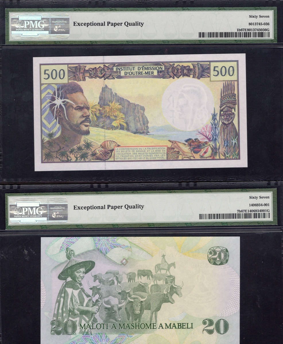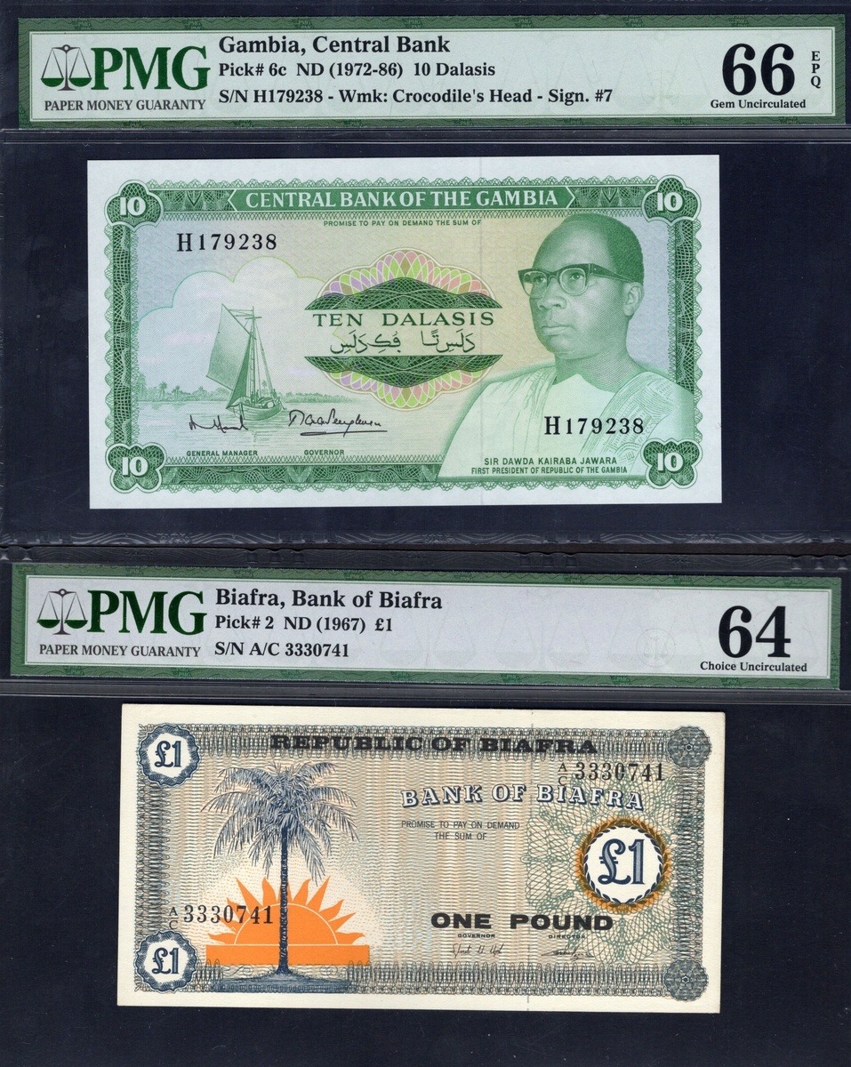 Group of PMG-graded African and other banknotes: Biafra, Bank of Biafra. 1 Pound. ND (1967). Choice Uncirculated 64; Gambia. Central Bank of the Gambia. 10 Dalasis. P-6c. Gem Uncirculated 66 EPQ; and Lesotho. Central Bank of Lesotho. 20 Maloti. 1984. P-7b. Superb Gem 67 EPQ; also French Pacific Territories. 500 Francs. ND (1992). Superb Gem Unc 67 EPQ; and Lebanon. Banque du Liban. 1 Livre. 1973. P-61b. Gem Uncirculated 66 EPQ. [5]
