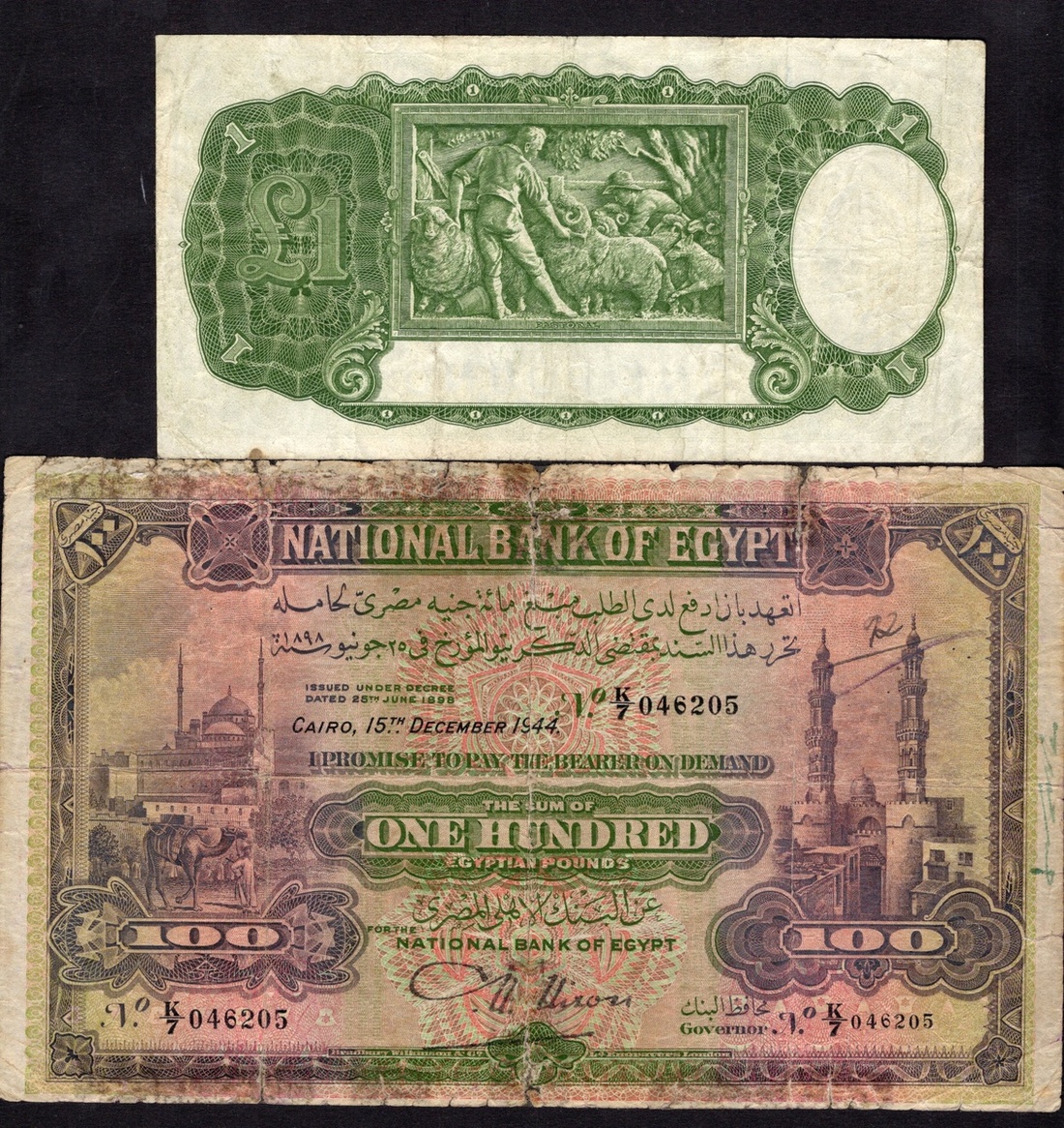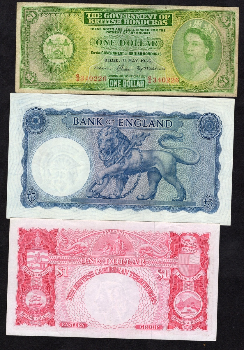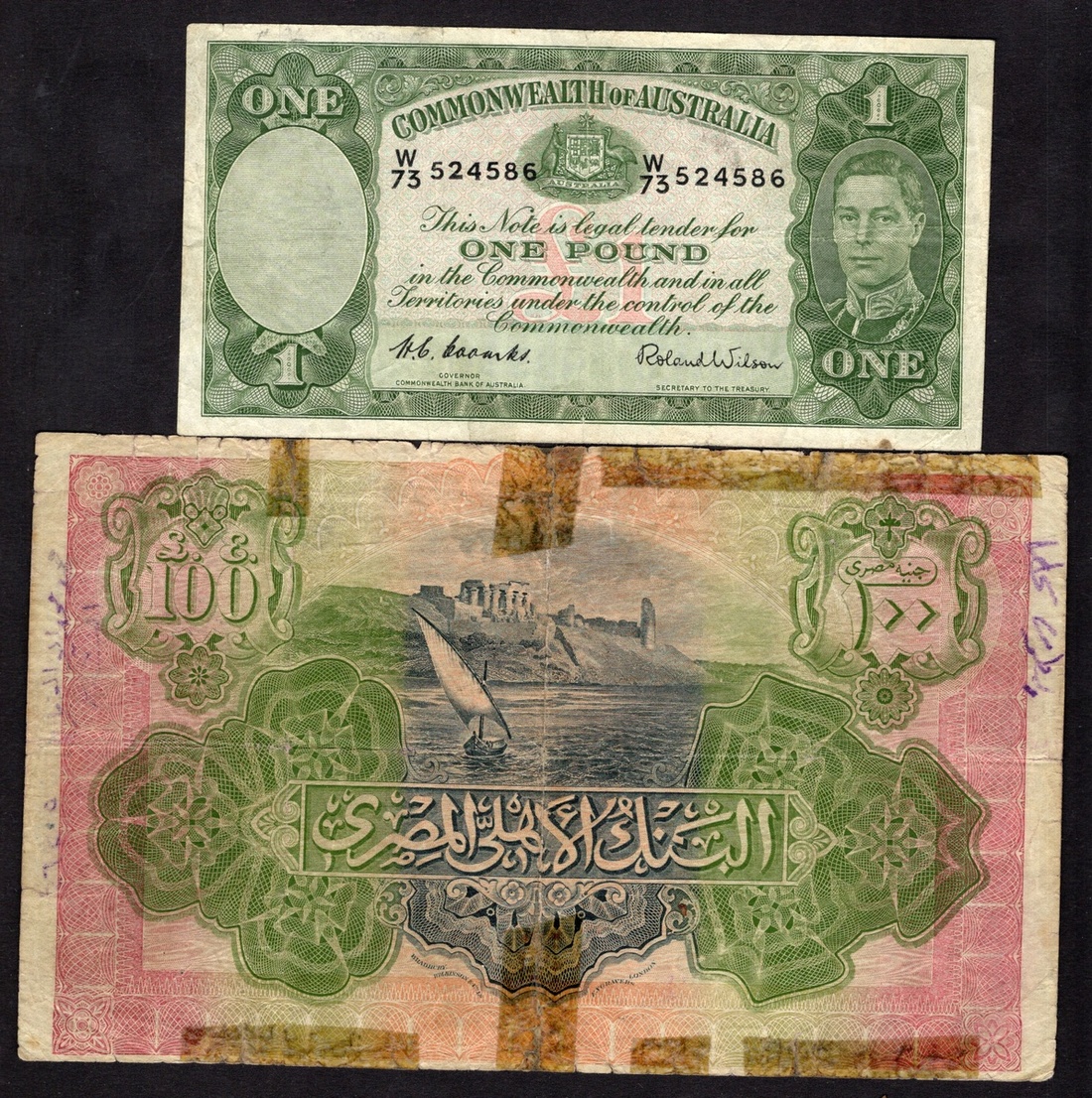 British Commonwealth Lot. Includes: Australia. 1 Pound. (1952). P-26d. Fine; 1 Pound. P-34a. VF; British Caribbean Territories. 1 Dollar. P-7b. VF; British Honduras. 1 Dollar. 1965. P-28b. About Fine; and Great Britain. 5 Pounds. (1957-1961). P-371a. EF; also Egypt. 100 Pounds. 15 December 1944. P-17d. VG, dark tape backing. [6]