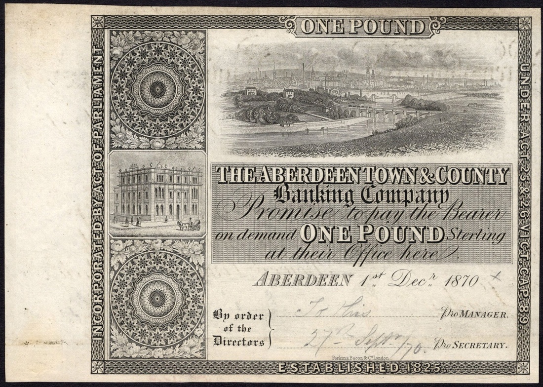 Scotland. Aberdeen Town & County Banking Company. 1 Pound Proof. Aberdeen, 1st Dec. 1870. D.6. Uniface Proof on paper. City riverview upper center., panel with fancy circular patterns flanking bank building. "To this 27th Sept./70" penciled bottom center. Light mount stain back two corners. Extremely Fine. Ex Dix Noonan Webb Sale, Sept. 12, 2008, lot 1185.