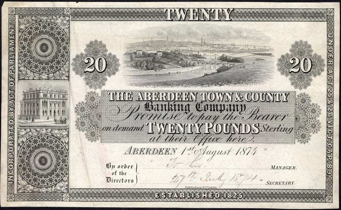 Scotland. Aberdeen Town & County Banking Company. 20 Pounds Proof. Aberdeen, 1st August 1874. D.9. City riverview upper center., panel with fancy circular patterns flanking bank building. "To this 27th July 1874" penciled bottom center. Rare. Light creasing left side, light mount stain back two corners Very Fine. Ex Spink Sale, June 10, 1995, lot 286.