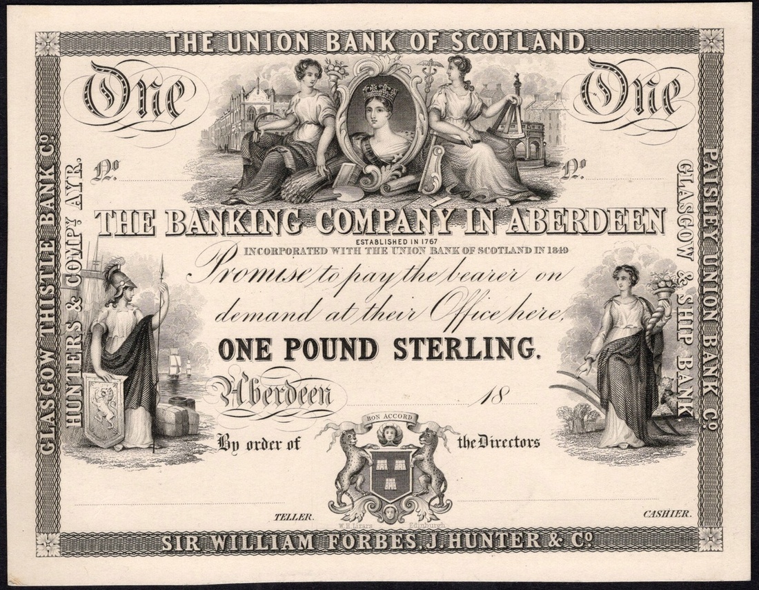 Scotland. Banking Company in Aberdeen. 1 Pound Proof. Aberdeen, 18xx. D.12. Proof on card. Young Queen Victoria portrait flanked by Agriculture and Knowledge upper center, Britannia standing lower left, Abundance lower right. Lovely Lizars engraving. Very rare. Fresh and attractive. Good Extremely Fine. Ex Spink Sale, September 1999, lot 21.
