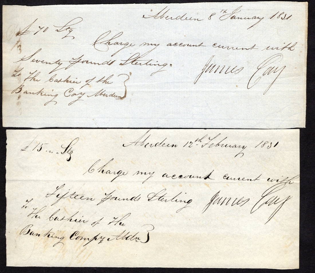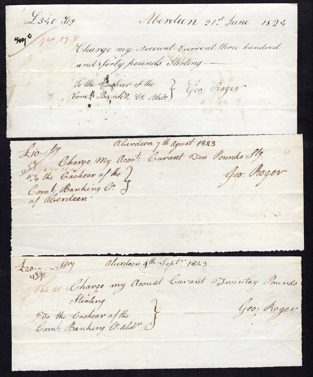 Scotland. Aberdeen. Quintet of 19th Century Checks: Commercial Banking Co., Aberdeen. 10 Pounds, 7 August 1823, 20 ("Twintay") Pounds, 9 Sept. 1823, 340 Pounds, 21 June 1824 - Geo. Roger; and Banking Co., Aberdeen. 70 Pounds, 8 January 1831 and 15 pounds, 12 February 1831 - James Cay. Very Fine. [5]