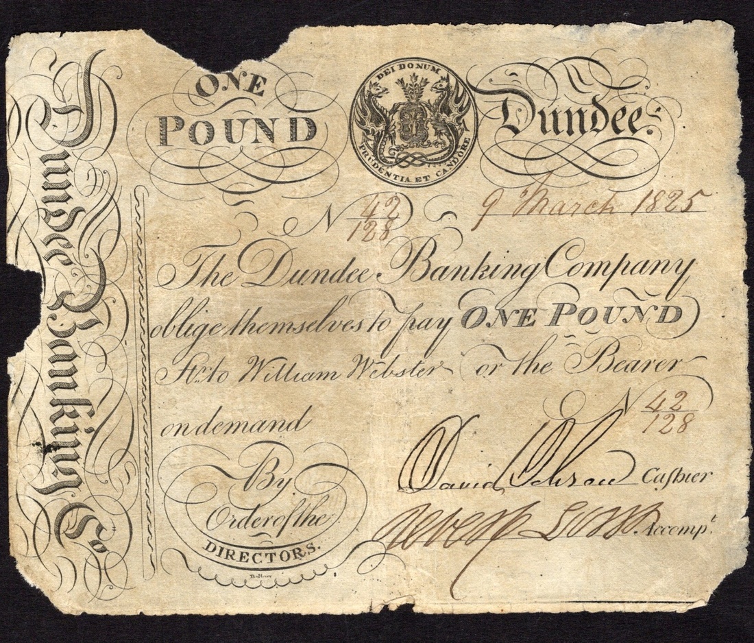 Scotland. Dundee Banking Company. 1 Pound. 9 March 1825. D.14. No. 42/128. Black and white. Arms top center, one manuscript signature, one printed, "pay to William Webster or the bearer" in text at center. Red and black revenue stamp on back, watermarked paper. Some pieces out in margins, otherwise Fine and rare. Ex Spink Sale, Sept. 12, 2005, lot 368.