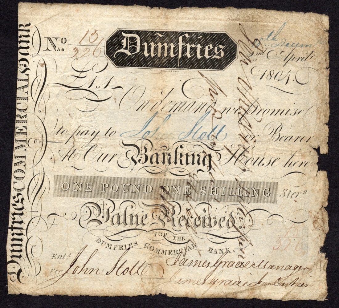 Scotland. Dumfries Commercial Bank. 1 Guinea. 2nd April 1804. PMS DF2. No. 15/326. DUMFRIES in cartouche upper center, "One Pound One Shilling" in shaded panel mid center. About Fine.