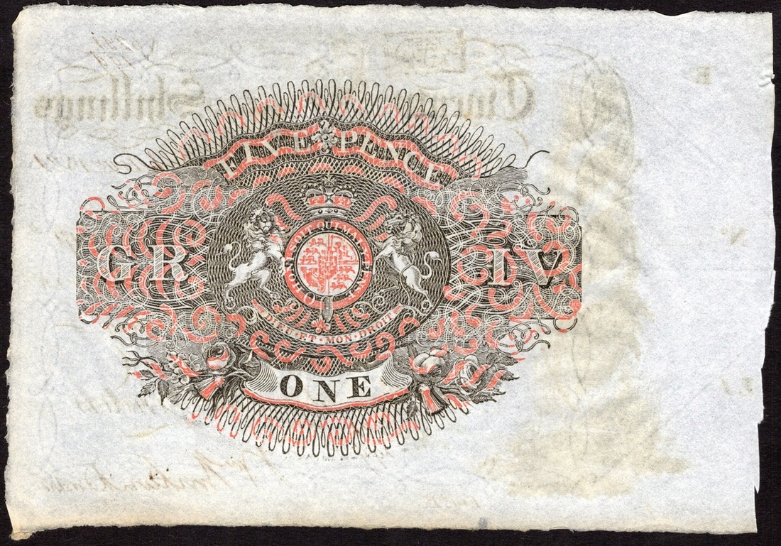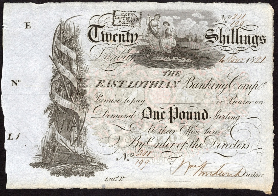 Scotland. East Lothian Banking Company. Twenty Shillings. 1 Nov. 1821. PMS EA 1b. No. 201/199. Abundance pouring out cornucopia upon maiden's lap, scroll on agricultural implements at left; red, white and black Arms on back. Unissued. Extremely Fine.