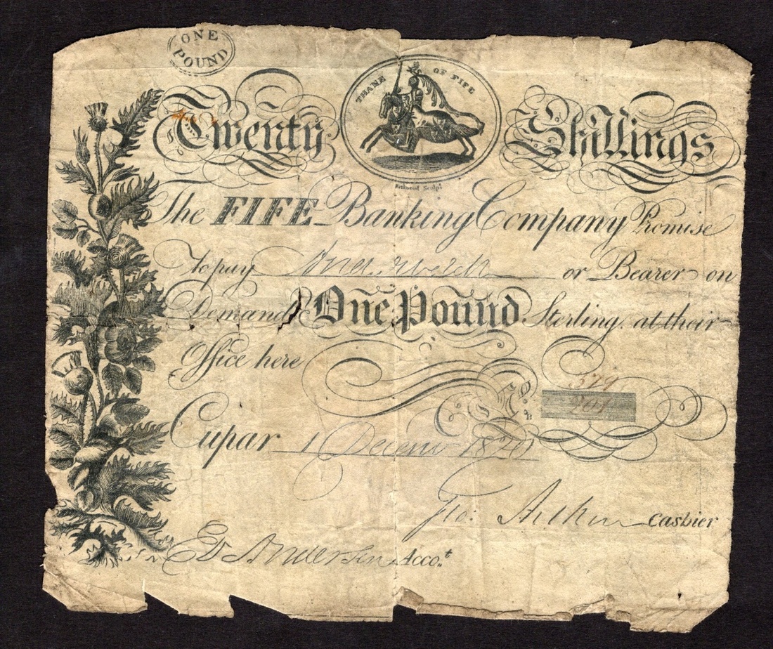 Scotland. Fife Banking Company. 20 Shillings - 1 Pound. 1 December 1820. D--. No. 329/201. Thane of Fife upper center, column of roses and thistles left. Would appear to be a contemporary forgery, but the engraving is superior, so possibly a genuine note with dubious date and signatures. Rare. Soiling on blank back. Very Good. Ex Spink Sale, Sept. 12, 2005, lot 390.