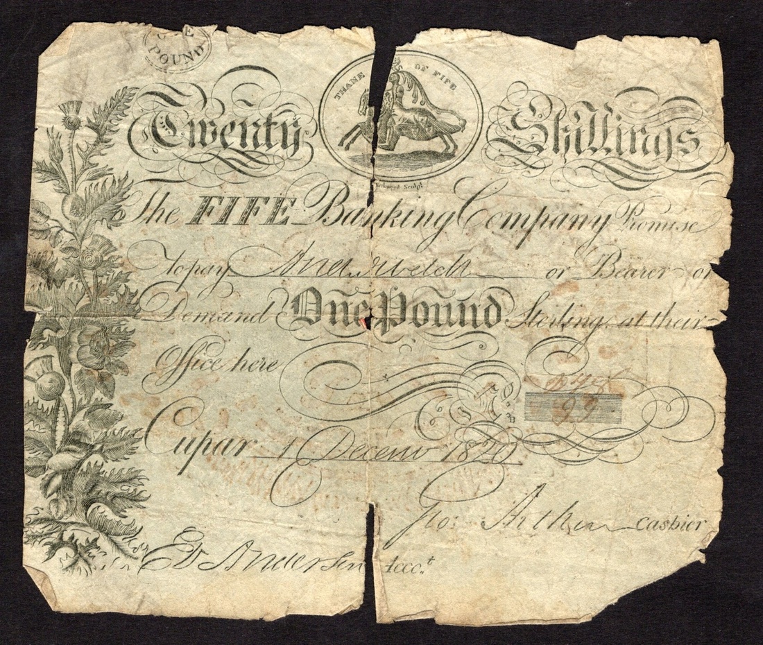 Scotland. Fife Banking Company. 20 Shillings - 1 Pound. 1 December 1820. D--. No. 048/99. Thane of Fife upper center, column of roses and thistles left. Most likely a contemporary forgery. Rare. Tear in center. Fair-Good.
