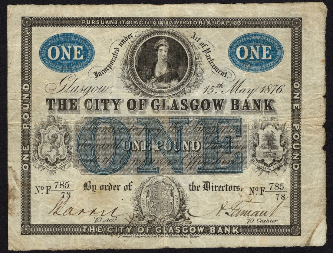 Scotland. City of Glasgow Bank. 1 Pound. 15th May 1876. Douglas 6. No. F 785/78. Young portrait of Queen Victoria upper center, Arms left, right and below. Inked notation on back: "Alexander Johnston 17 Mill Street". Fine and rare. Ex Banking Memorabilia Sale, July 1, 2008, lot 118.